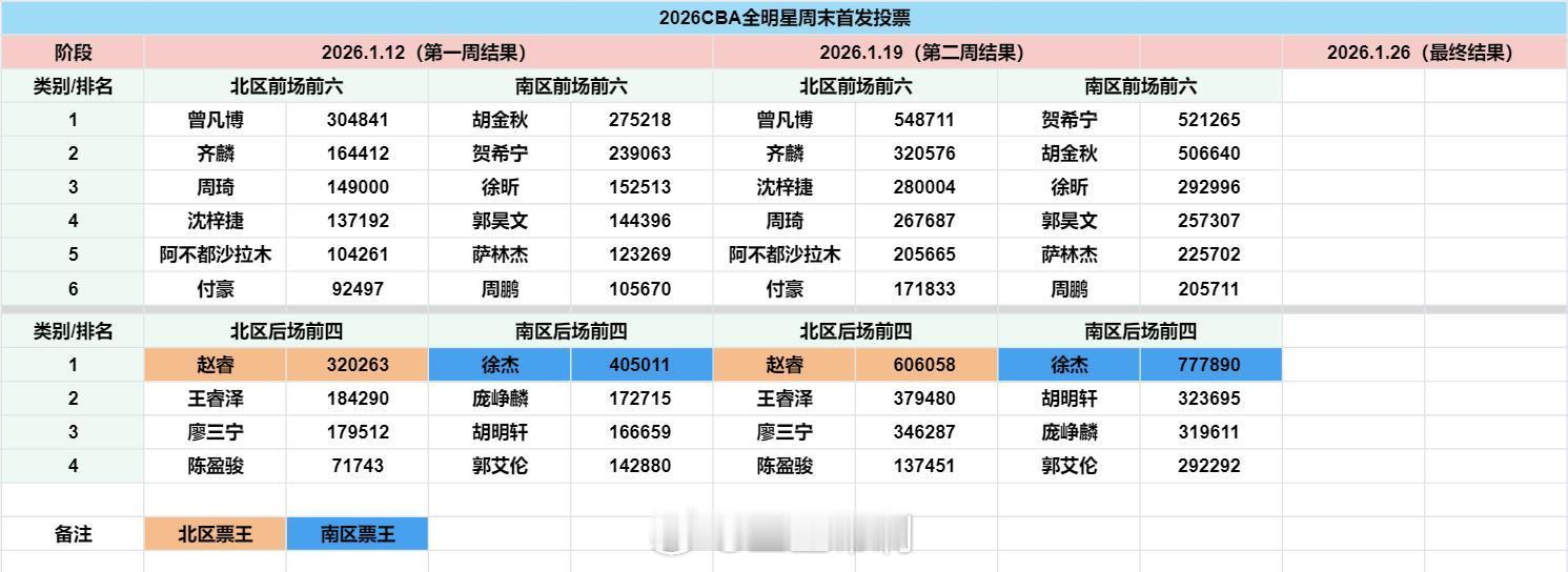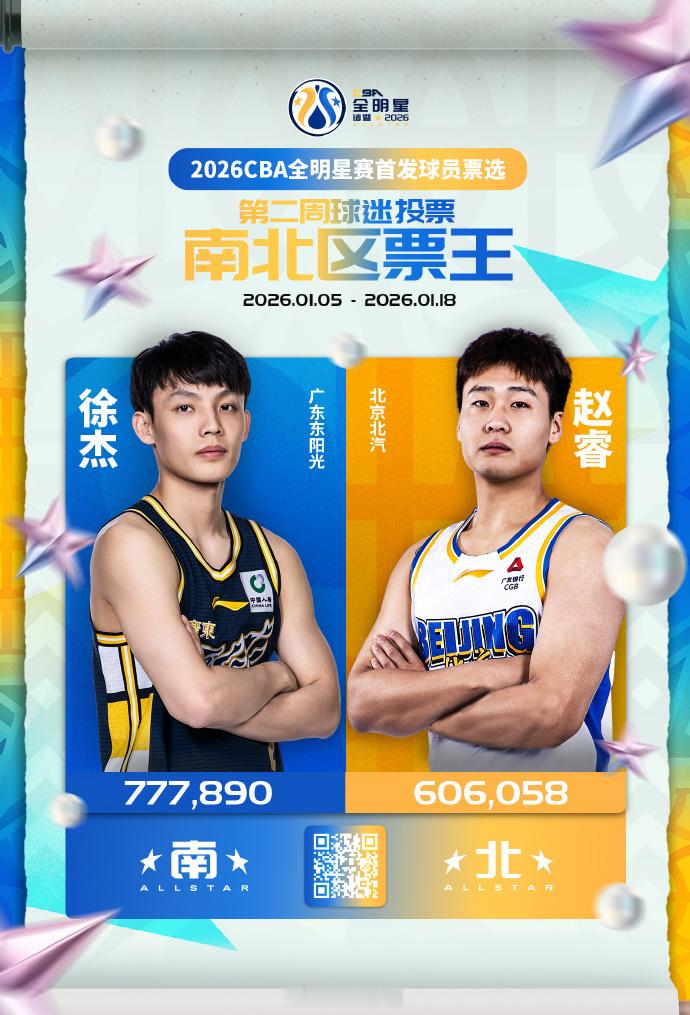 2026CBA全明星周末 全明星首发投票第二周结果,徐杰与赵睿依然是南北区票王,总票王徐杰已经扩大优势。人气前三还是徐杰、赵睿、曾凡博。第二周主要变化:北区:沈梓捷超越周琦南区:贺希宁超越胡金秋、胡明轩微弱票数反超庞峥麟