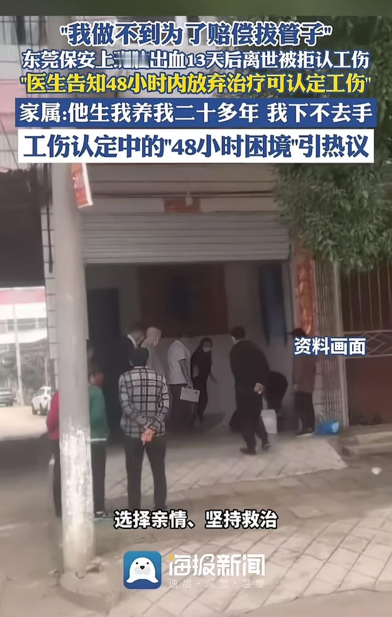 “我做不到,为了赔偿拔管子!”! 东莞,保安父亲上班脑出血,医生告知儿子48小时内放弃治疗,可认定工伤!儿子:“他生我养我二十多年 我下不去手……”13天后,父亲还是抢救无效死亡,申请工伤认定被拒,网友炸锅! 年逾半百的保安蒋文武,于小区岗亭恪尽职守地执勤。命运猝不及防地降临,他毫无预兆地一头栽倒在地,令人揪心。当救护车呼啸而至,送医仅仅一小时后,他的双侧瞳孔已经散大。在医学临床上,这被称为脑疝,意味着死神已经站在了床头。 ICU门外,儿子蒋海接到的不仅是病危通知书,还有那个关于《工伤保险条例》第十五条的“温馨提示”。条款规定得明明白白:在工作时间和工作岗位,突发疾病死亡或者在48小时之内经抢救无效死亡的,视同工伤。这条法律红线,此刻变成了悬在头顶的达摩克利斯之剑。 此时的局面荒诞而惊悚:摆在蒋海面前的,是一场关于父亲生命的“豪赌”。现在的每一分每一秒,不再是抢救生命的黄金时间,而是倒向“人财两空”的沙漏。潜台词赤裸得让人不寒而栗:你若现在签字放弃,让父亲在48小时内合规“死亡”,几十万赔偿金就能到手。你若执意要做个孝子,坚持抢救,一旦时间跨过48小时的那条线,人救不回来,钱也别想要。 蒋海脑海里闪过的是父亲每月仅有的3500元微薄工资,是自己至今还没攒够的彩礼钱,更是老人常年舍不得买一件新衣的背影。 然而,现行的制度却在冷冷地告诉他:在这个规则里,孝顺是有高昂成本的。每多让父亲在这个世界上停留一小时,你们离那笔救命的赔偿金就远了一步。 在那漫长的13天里,蒋海像一尊雕塑般守在ICU门口,听着监护仪发出单调的滴答声。那每一声机械的声响,都仿佛是倒计时的警钟,在提醒他你正在错过那个价值几十万的“黄金48小时”。 是制度漏洞还是人性陷阱?此事一经曝光于网络的聚光灯下,舆论旋即沸腾起来,恰似在一锅滚烫的热油中猛然泼入一瓢冷水,瞬间炸开了锅。 无数网友开始计算这笔残酷的账目:如果家属在48小时内狠心放弃,家属拿到了赔偿,医院节省了ICU紧缺的医疗资源,企业虽然赔了钱但了结了责任除了那个躺在病床上被提前终结生命的人,似乎所有人都“赢”了。 更加魔幻现实主义的是,评论区里竟然真的有人现身说法,字里行间透着无奈的血腥气:“我叔去年也是脑出血,家里穷,医生暗示我们别救了,第47小时拔的管,确实拿到了工伤赔偿。” 这番话引来了一片骂声,指责其冷血。但紧接着,更多刺痛人心的反问淹没了道德的指责:“站着说话不腰疼,你家欠着几十万外债试试?不拿这笔钱,老人的葬礼都办不起,活着的人还要不要活? 脑死亡在现代医学上早已有明确的定论,瞳孔散大、脑干反射消失即意味着生命终结。为什么我们的法律非要固执地等到心跳停止那一刻才算数? 更有法律界人士犀利指出,同样是工作岗位上突发疾病,有人在第47小时59分去世就是烈士般的工伤,有人在第48小时01分去世就成了无人问津的病亡这短短两分钟的物理差距,凭什么就能决定一个家庭的生死荣辱? 这一事件不禁让人联想到另一个同样荒诞的新闻:某地一名环卫工人在凛冽寒风中猝死在清扫岗位上,仅仅因为在送医途中、在此后的抢救中超过了48小时才彻底断气,同样被无情地拒绝了工伤认定。 当我们对比那些动辄挂在嘴边的“弘扬工匠精神”、“关爱劳动者”的宏大口号,现实发生的这一切简直就是一记响亮的耳光。当法律条款把劳动者的生命价值精确计算到小时,把家属对亲人的不舍与孝心换算成能否理赔的筹码时,它所保护的早已不再是那个有血有肉的“人”,而是一张张冰冷的成本核算表。 更深层次的问题在于:为什么医生要“悄悄提示”?为什么家属要在抢救室外像防贼一样掐表计时?根源在于,我们现行的制度把“突发疾病”和“工伤事故”这两个概念混淆,却又试图用一条简单粗暴的时间线来进行切割。 众所周知,脑出血、心梗等突发性疾病,向来与长期的过度劳顿、沉重的工作压力紧密相连,二者之间的关联错综复杂,难以分割。 目前,蒋海不服人社局的决定,已经提起了行政诉讼,案件正在审理之中。蒋海在那段最绝望的日子里曾哭诉:“我知道有人为了拿赔偿,在48小时内主动放弃治疗……但我做不到。难道孝顺,反而成了‘错误’?”这句反问,振聋发聩。 而对于围观的我们来说,更多人关心的是:下一个倒在岗位上的,会不会是我们自己的父母?那些每天工作超过12小时的外卖骑手、保安大叔、清洁工阿姨,他们的命,难道就只值那“48小时”的有效期吗? 一个真正的文明社会,绝不应该让救人的每一秒钟都变成索赔的倒计时,更不该逼迫一个儿子在父亲的病床前,手里捏着秒表,计算着“还能撑多久才不算白花钱”。