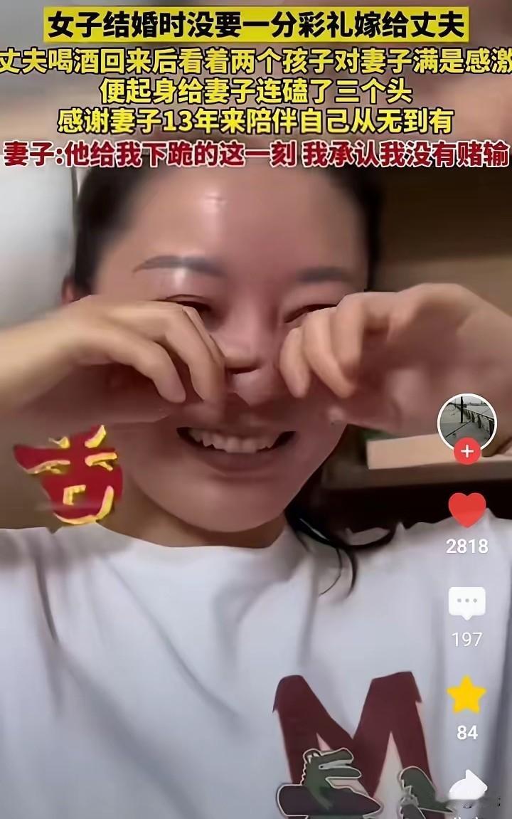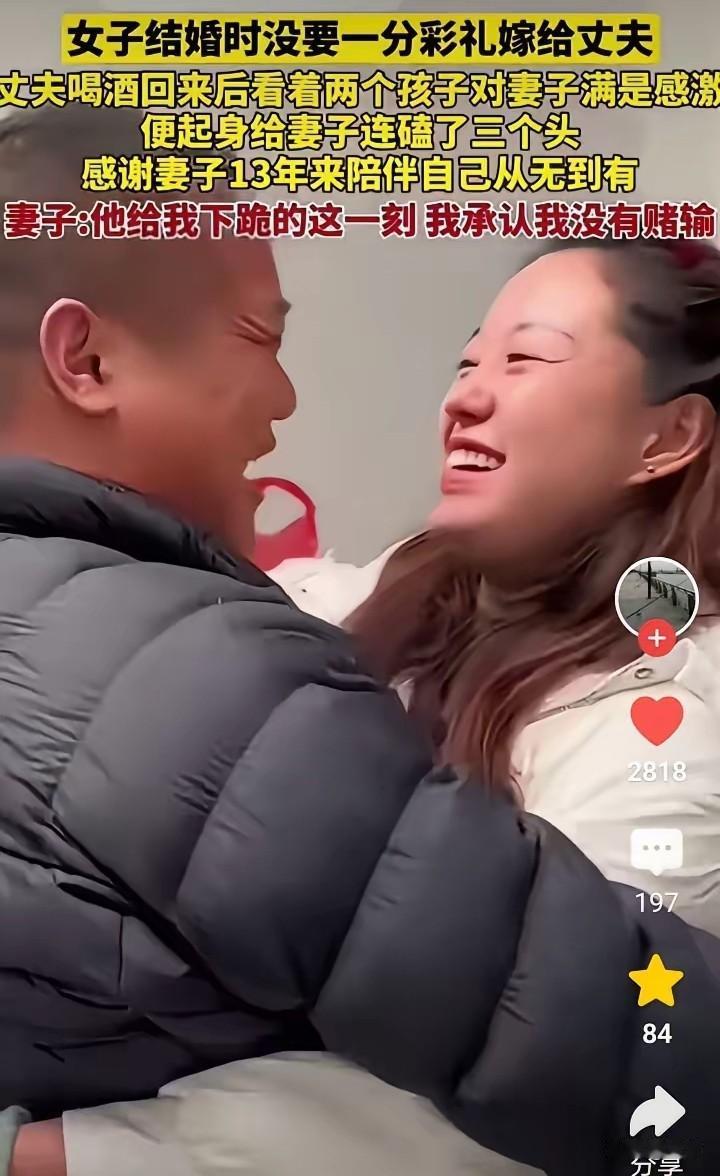 最近有个视频火了:男人喝点酒回家,看到老婆孩子,想起13年前老婆没要彩礼就嫁他,如今日子好了,当场磕三个头谢恩。 老婆笑着说:"他磕头那一刻,我就知道这婚没嫁错!" 13年前,小伙子穷得叮当响,老婆却不要彩礼。亲戚都劝:"不要彩礼,以后吃亏咋办?"但老婆说:"我看中他人,不是钱。" 这些年,老婆带孩子、做家务,还帮丈夫打拼。丈夫从摆摊到开店,日子越过越好。 那天丈夫喝了酒,看着家里热乎劲儿,想起老婆这些年付出:自己生病她照顾,生意失败她支持,孩子教育她操心...越想越感动,就磕头谢恩。 有人说:"男人磕头多丢人!"但丈夫觉得:"对恩人就该这样!" 彩礼不是婚姻的保险,磕头不是必须的仪式,幸福是两人一起奋斗来的! 就像丈夫说的:"她跟我时一无所有,现在我要让她过好日子。"老婆觉得:"他肯为我放下面子,这份心比彩礼金贵!" 不要彩礼是选好种子,一起奋斗是勤浇水,磕头谢恩是丰收乐! 您说,这婚,她赌对了吗?