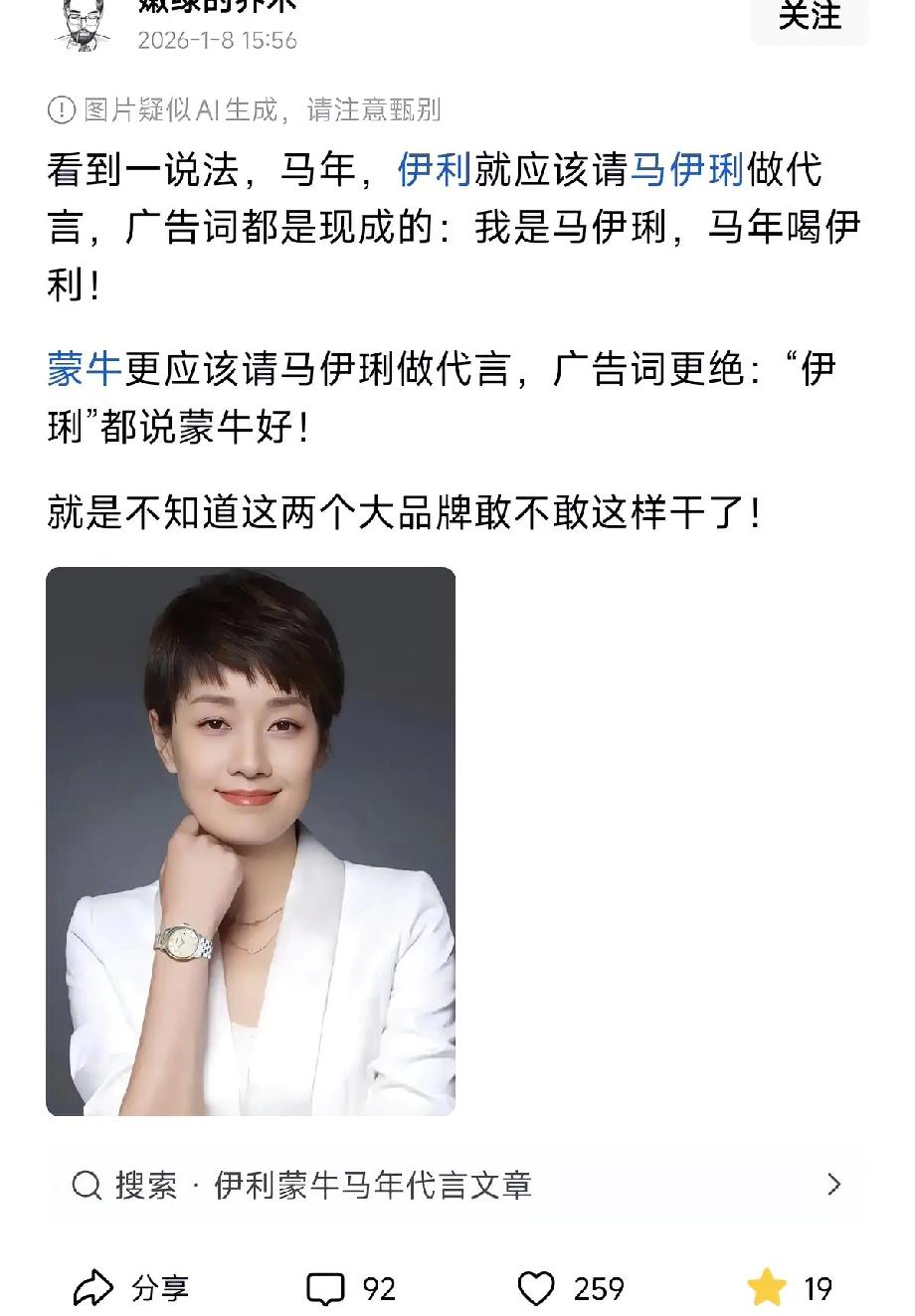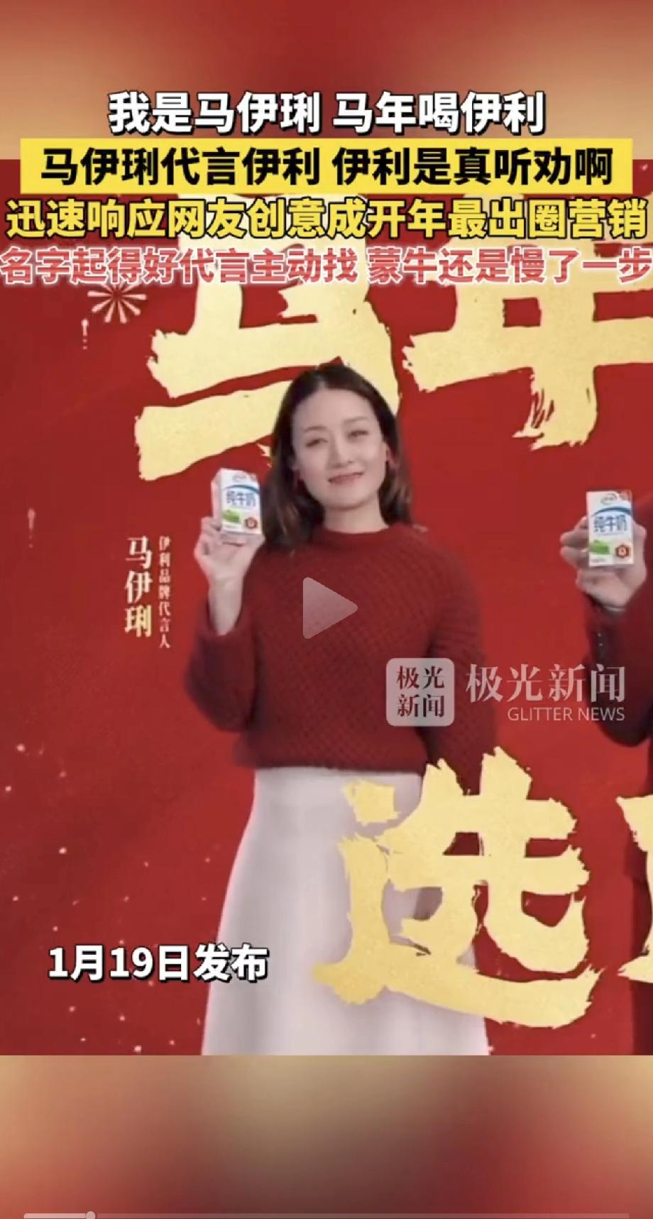伊利果然还是听劝的。 万万没想到 今天早上就刷到了伊利的最新广告了其中代言人就有马伊琍! 之前就有网友神预测到了,伊利估计会请马伊琍来代言,但是也有可能蒙牛去请过来代言,就连广告词都写好了。 但现在来看,估计伊利是先人一步,这下应该没有蒙牛什么事了吧! 这么看来,蒙牛还是有点可惜,如果马伊琍代言了蒙牛的话,都可能会更刺激! 这真的是想不到,有一天取个好名字,也能够躺赢啊!
