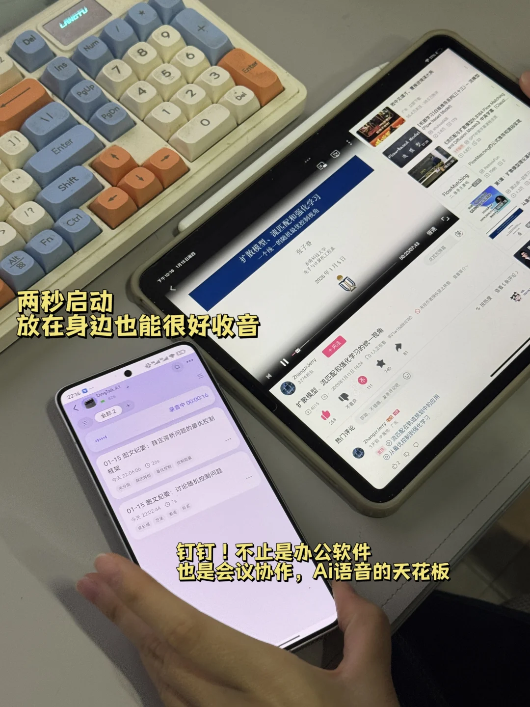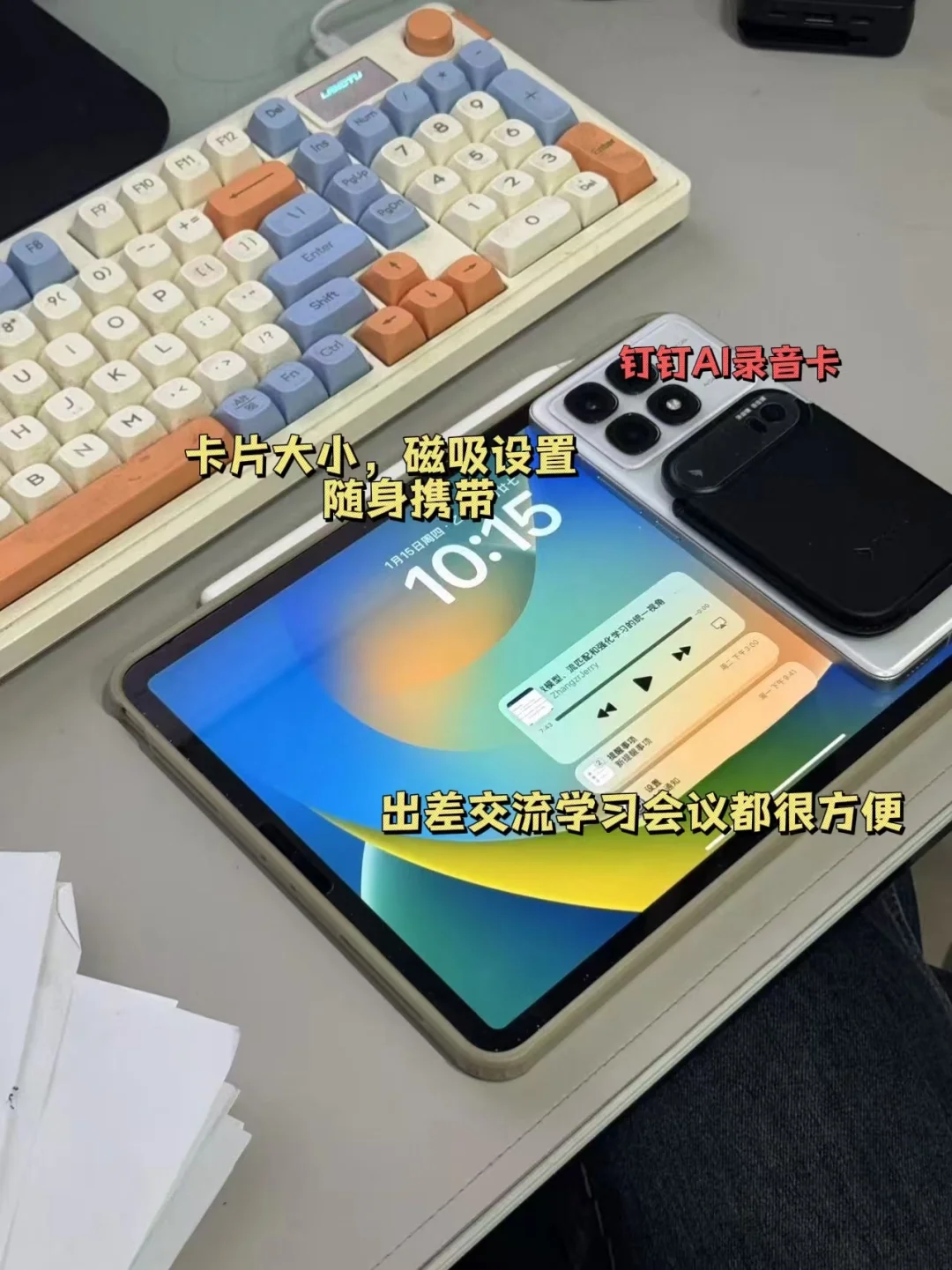 后来我就开始用钉钉AI录音卡,把它贴在手机上,很轻薄,讨论时拿起手机就能用,6麦克风阵列,录音非常清晰(口音重也能精准识别)