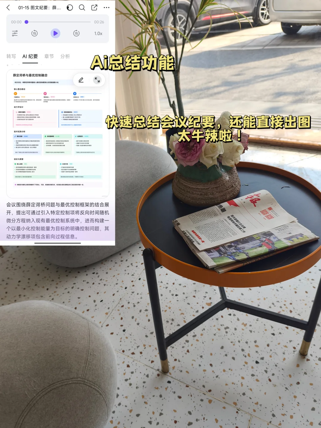 会议结束后就自动生成纪要了,无需手写,而且AI会自动总结内容,结构清晰,重点突出,说实话比我自己事后回想的记录强多了