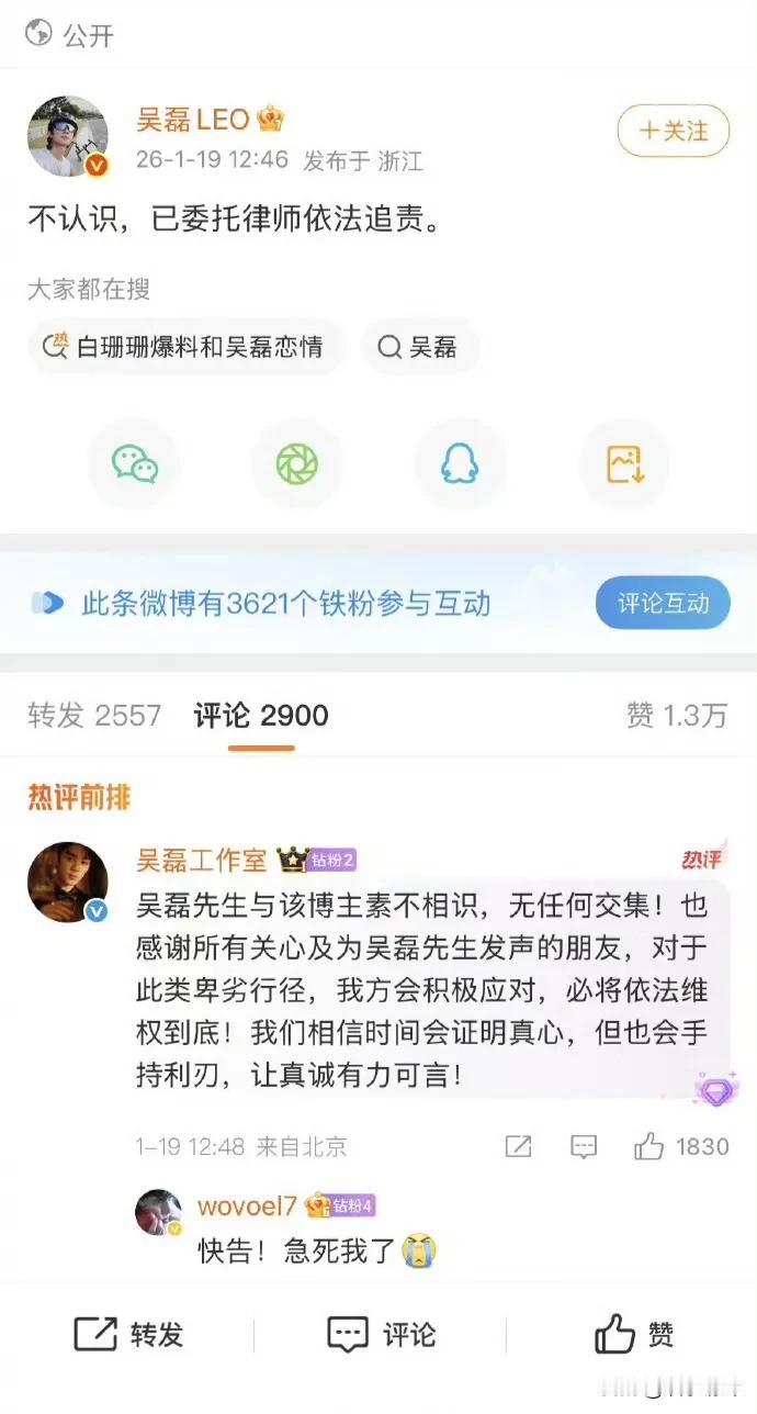 吴磊起诉了,白珊珊改口说是被盗号了,她不会以为判定盗号单凭她口述就行了吧?很难想象已经2026年了,爆料连一张聊天记录,甚至同框照片都没有,但即便如此,总有人信誓旦旦肯定有事但是被公关了,真是欲加之罪何患无辞啊。 原来是开局一张图,内容全靠编,现在连图都没有了,直接编,从这个角度看,别看公众人物赚钱多,还真不是一般人能够当的,但凡心理素质差点,早就奔溃了。 白珊珊的问题还在于她居然直接艾特了吴磊,要是没有艾特,她说是同名同姓的,还真拿她没办法,这白珊珊纯粹是自己作。支持吴磊维权,不能放过每一个居心叵测随意抹黑造谣他人的人,否则一旦成功就会有人效仿,下一个受伤害的可能就是你,做恶者只要有利可图,不会管你是名人还是普通人!
