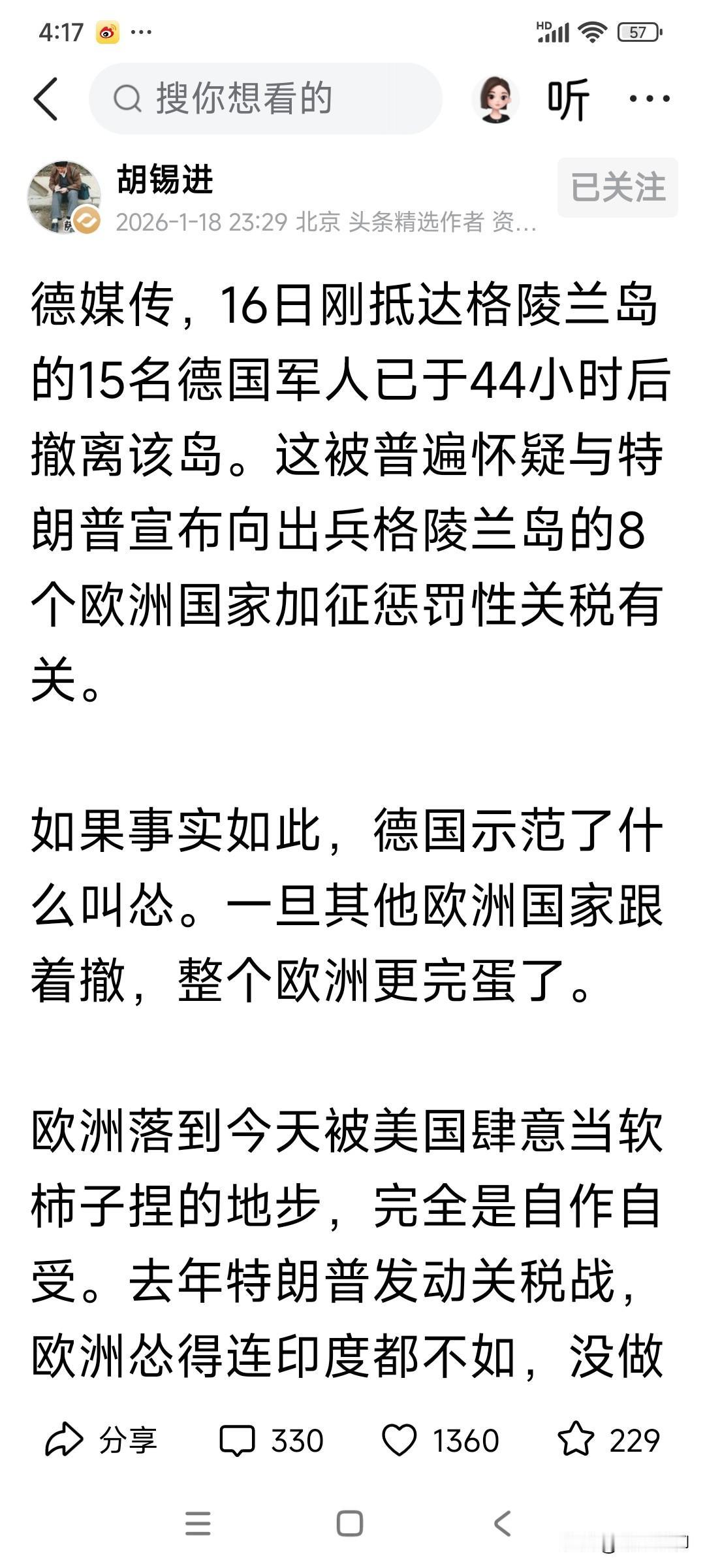 面对特普,德国包括欧洲已经陷入不知如何是好的尴尬景态,左右尴尬,的确不如老胡说的,你们一心自己干可能是另一番天地[呲牙] 德国联邦国防军代表、中校i彼得·米莱夫丘克在接受德国《芬克媒体集团》采访时表示,德军icon已完成在格陵兰岛的既定任务,现已撤离该岛。