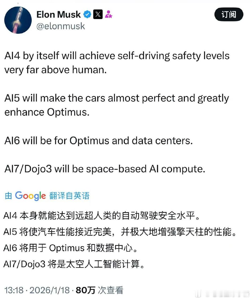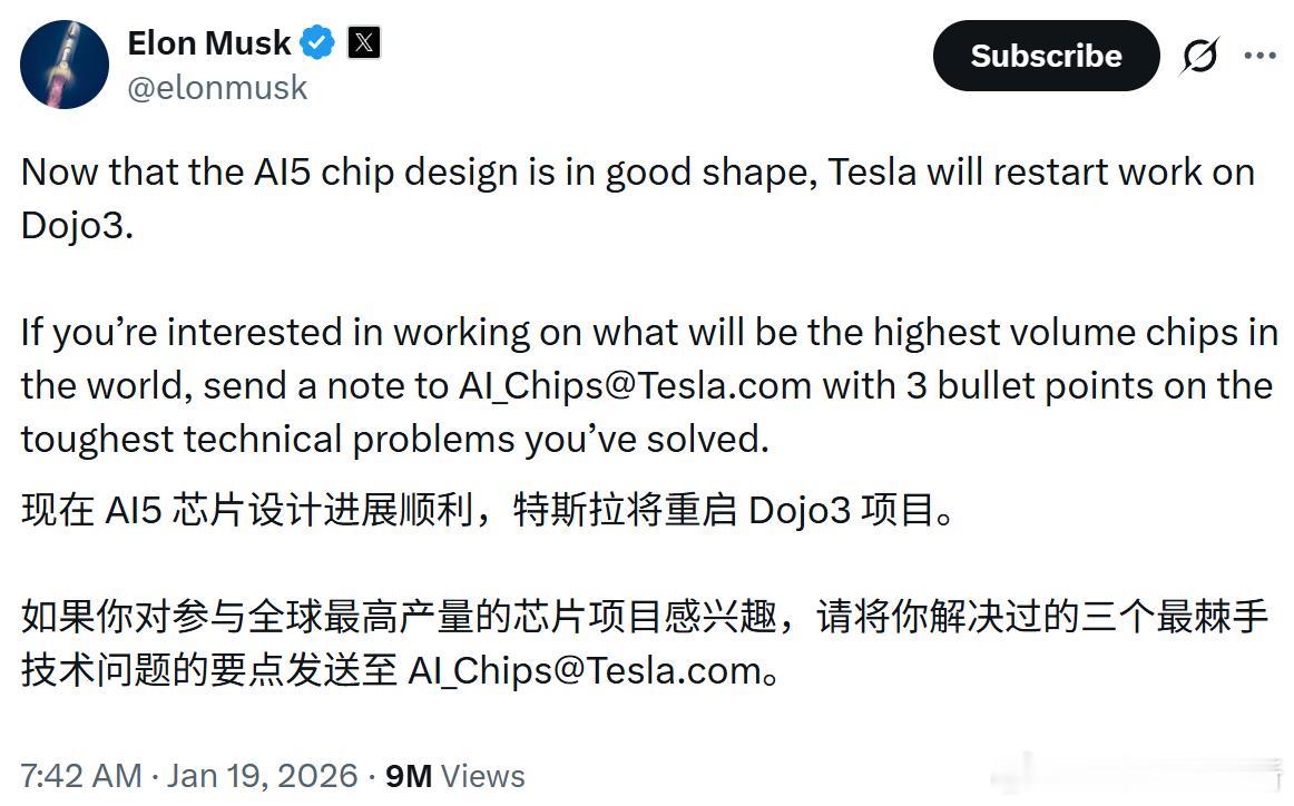 马斯克:现在 AI5 芯片设计进展顺利,特斯拉将重启 Dojo3 项目。他在这几天还提到了 AI6 尚处于早期阶段,后续将会推出 AI7、AI8、AI9 版本的芯片,芯片设计的目标周期是 9 个月。马斯克芯片将推至AI9马斯克AI5芯片设计接近完成