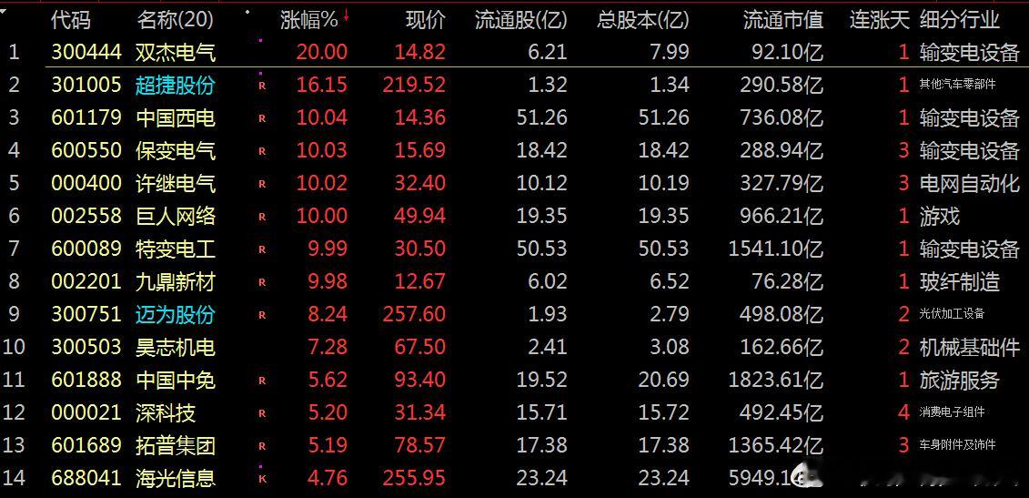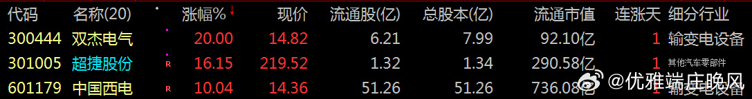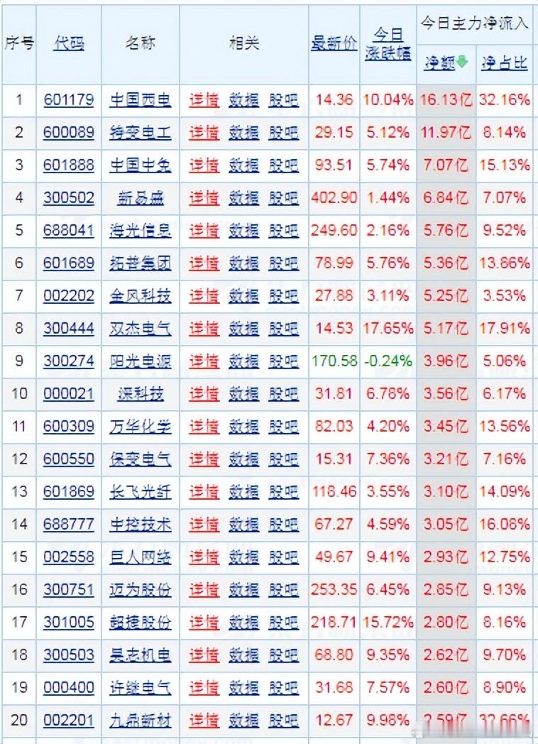 【财富晚茶】潜龙浮出水面:01.19主力资金:净流入前20股票导语:作者系《网易号》优质财经领域创作者。曾经原创作者和知名网易号旅游领域创作者。大跨度行业等的写作,颇受网友喜爱。作品发表于2026.01.19.18:18 优雅端庄晚风。【内容概述】今日股市收评:主题是:【财富晚茶】潜龙浮出水面:01.19主力资金:净流入前20股票。主旋律:今日主力资金:净流入前20股。主力投资潜龙浮出:越战越勇叠创新高。300444 双杰电气 301005 超捷股份 601179 中国西电1、风口行业:最佳公司第一、300444 双杰电气靓丽底牌:中国配电网侧设备优势供应商。第二、301005 超捷股份靓丽底牌:中国商业航天领域稀缺结构件供应商。第三、601179 中国西电靓丽底牌:世界输配电一流企业。二、视野背景:资金为王:前20强股复盘潜龙:浮出水面追踪资金:沪深北市:净流入股票。市场资金:净流入板块:输变电设备、汽车零部件、游戏及相关科技领域。多重利好因素:包括行业政策支持、市场需求增长、国际事件催化等。1、601179 中国西电收盘价:14.36元。涨跌幅:10.04%。净流入: 16.13亿。核心逻辑:世界输配电一流企业。收盘点评:子公司西安西电电力电子有限公司为“东数西算”数据中心提供固态变压器产品。连续中标国家电网和南方电网多个重大项目,总金额超过50亿元,占2024年营收约20%,其中多次为特高压项目,凸显高端电力设备领域的技术领先地位。2、600089 特变电工收盘价:29.15元。涨跌幅:5.12%。净流入:11.97亿。核心逻辑:全球信赖的能源服务商。收盘点评:承担了多项国家重大工程,市场份额稳居国内第一。“能源+航天”双轮驱动。参股北京无线电创新院,绑定商业航天“国家队”,构筑“能源+通信”跨界融合优势。今日涨停政策利好作为光伏和电网设备龙头,直接受益于政策红利。资金大幅流入:主力资金净流入超15亿元,位居当日首位。3、601888 中国中免收盘价:93.51元。涨跌幅:5.74%。净流入: 7.07亿。核心逻辑:世界一流全球化旅游零售商。收盘点评:垄断海南离岛免税85%份额,三亚免税城年销售额占全国85%,封关后计划新增10万平米免税店,供应链优势稳固。4、300502 新易盛收盘价:401.38元。涨跌幅:1.05%。净流入: 6.84亿核心逻辑:高速光模块技术领先。收盘点评:800G产品全球市占率35%,中标英伟达大订单。光模块产品受益于数据中心建设,北向资金持续加仓。光模块作为数字经济基础设施,受AI算力需求推动,成为资金关注热点。全球数据中心建设:海外大客户订单放量,AI算力基建核心标的。5、688041 海光信息收盘价:249.60元。涨跌幅:2.16%。净流入:亿 5.76亿核心逻辑:AI算力核心供应商。收盘点评:国产x86架构的唯一掌握者,获x86指令集永久授权,国内唯一能基于x86架构研发高端处理器企业。构建“推理(海光DCU)+训练(模拟芯片)”全链条算力解决方案。换股吸收合并中科曙光,打造一个技术互补、规模更大的算力巨头。6、601689 拓普集团收盘价:78.99元。涨跌幅:5.76%。净流入: 5.36亿核心逻辑:特斯拉Tier0.5供应商。收盘点评:平台化“8+N”产品线兑现期,单车价值量翻倍。八大模块同步开发,深度绑定特斯拉等头部客户。进入特斯拉Optimus第三代机器人供应链。AI液冷服务器获首批约15亿元订单,客户包括华为等。技术面呈现多头排列,5家券商联合推荐。7、002202 金风科技收盘价:27.88元。涨跌幅:3.11%。净流入: 5.25亿核心逻辑:全球领先风电提供商。收盘点评:外部待执行订单接近50GW。全球新增风电装机连续三年排名第一。16MW海上风电机组单机容量全球前列。海外市场毛利率高于国内,10MW+机型占比高,深度适配国际需求。8、300444 双杰电气收盘价:14.53元。涨跌幅:17.65%。净流入: 5.17亿核心逻辑:配电网侧设备优势供应商。收盘点评:固体绝缘环网柜技术领先十余年,市场占有率位居前列。内蒙古“绿色高碳铬铁源网荷储一体化项目”等示范工程落地。参与源网荷储一体化项目。推出液冷超充系统、签订大规模重卡换电站协议,并布局全钒液流电池等长时储能技术。9、300274 阳光电源收盘价:170.58元。涨跌幅: -0.24% 。净流入:3.96亿核心逻辑:储能龙头公司。收盘点评:通过在泰国、墨西哥等地布局产能,有效规避欧美关税,预计2026年海外营收占比将提升至65%。全球首发的PowerTitan 3.0 Plus储能系统,单位能量密度、循环寿命等指标行业领先。与英伟达合作的800V HVDC方案,预计2026年营收50-80亿元。10、000021 深科技收盘价:31.81元。涨跌幅: 6.78%。净流入: 3.56亿核心逻辑:全球领先专业电子制造企业。收盘点评:当日存储芯片板块受国产替代趋势和海外库存低位利好提振,深科技作为核心标的获资金关注。主力资金大幅流入直接推动股价上行,显示机构或大资金积极介入。11、600309 万华化学收盘价: 82.03元。涨跌幅:4.20%。净流入: 3.45亿核心逻辑:全球最大的MDI供应商。收盘点评:产能占全球需求的56%左右,TDI(甲苯二异氰酸酯)产能也位居全球首位。POE(聚烯烃弹性体)等新材料增速20%,年末产能达60万吨。切入光伏、新能源汽车等高增长赛道,向高科技材料供应商迈进。12、600550 保变电气收盘价:15.31 元。涨跌幅:7.36%。净流入: 3.21亿核心逻辑:特高压变压器的核心供应商。收盘点评:少数同时掌握1000kV特高压交流变压器和±1100kV直流换流变压器核心技术的企业。国内唯一具备为“华龙一号”核电机组提供主变压器能力。并入中国电