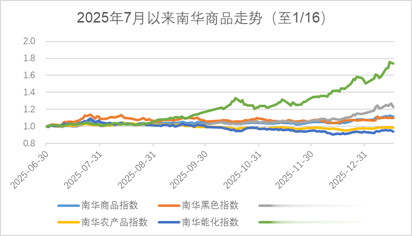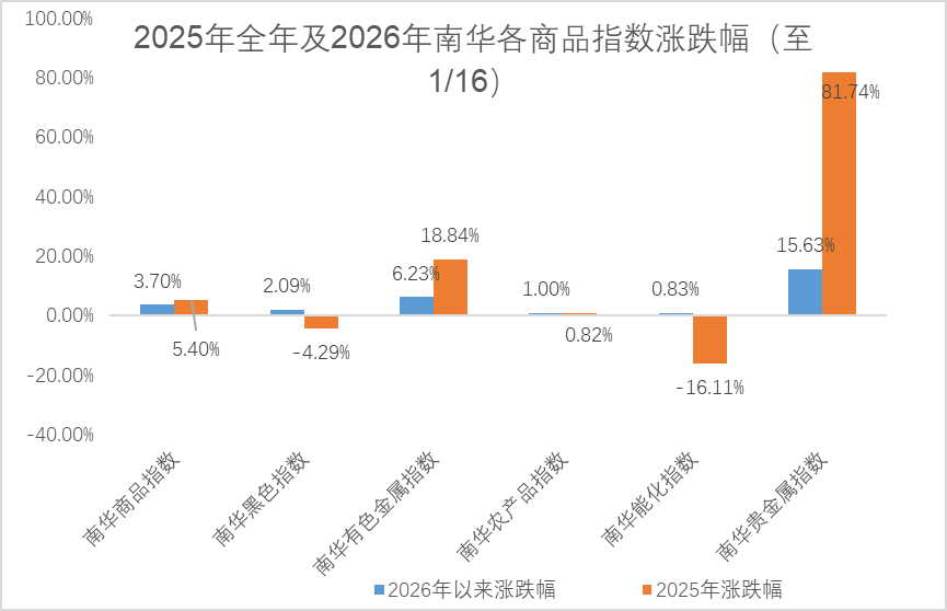 2025年南华商品指数上涨5.4%,细分指数中呈现结构性机会,以贵金属(82%)和有色金属(19%)为主。2026年以来南华商品指数上涨3.7%,贵金属和有色金属继续上涨,至1月16日分别上涨16%、6%。wind商品指数周度平均成交额3.8万亿、日均持仓额2993亿元,环比分别提升14%、10%。当前市场在讨论大宗商品超级周期是否已经到来?