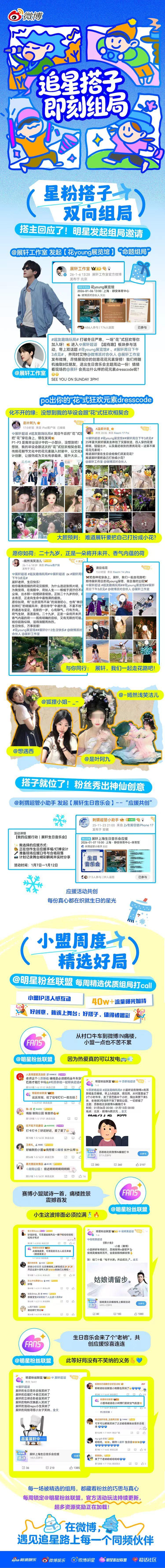 追星搭子即刻组局 企划【第一阶段高光合集】新鲜出炉🚀活动组局持续升温🔥&同担搭子一键速配💞活动上线15天,互动回应5万➕💬,6000➕人次参与活动👥,1.4w➕人次发起寻搭请求📝,成功收获求搭1800次✅,1000➕同担找到专属搭子🎊优质组局高能输出⚡,高光名场面持续刷新✨!演出应援🎤痛楼打卡📍同好交流💬…组局场景接连解锁🆕星粉搭子双向组局,让热爱成为一场共创邀约🤝偶像发起专属命题🎨,粉丝创意内容精彩回应🌟小盟周度精选好局持续打call📢,40w+流量曝光加持🚀!组局高光内容持续产出📈、神仙打卡返图点赞收藏❤️搭子组局新篇章已开启📖!每周关注