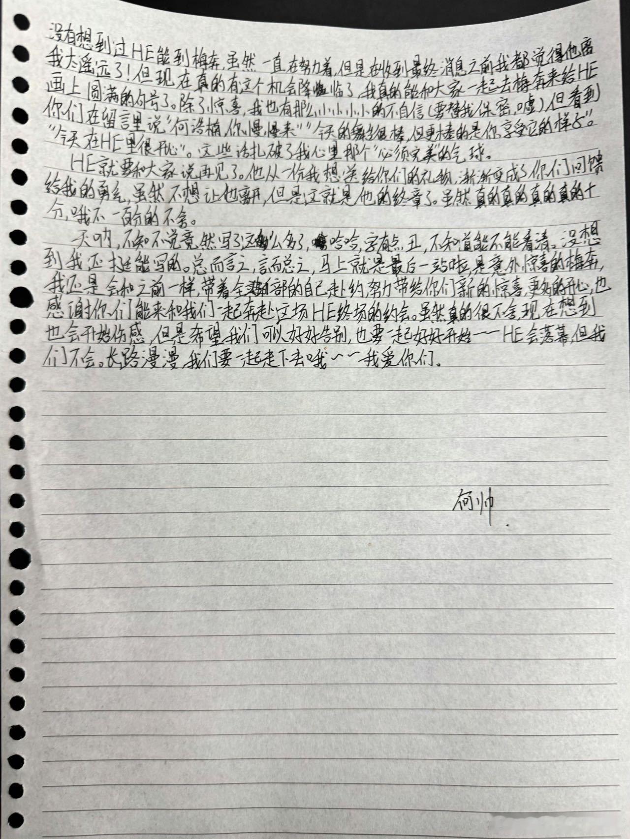 何浩楠给粉丝的手写信 看了写给粉丝的手写信,这完全是真诚小狗来的!HE的终章上海站马上就要来了,小何深夜手写千字信给粉丝表达感谢和不舍。他说HE是礼物,却不知这份真诚本身,才是最动人的。小何“不会说但会做”的含金量还在上升~