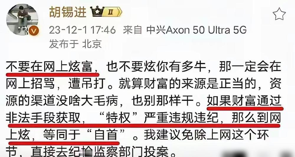 大V还是有远见了!现在看看李湘就知道了!胡锡进在2023年12月1日就发表过:“不要在网上炫富,也不要炫你有多牛,那一定会在网上招骂,遭吊打,就算财富的来源是正当,资源的渠道没啥大毛病,你也别那样干,如果财富通过…… 说实话,看到李湘的社交账号突然被禁止关注,我第一反应不是吃惊,而是觉得“这只靴子终于落地了”。 这些年她每次上热搜,几乎都离不开那些吓人的数字:一顿早餐能吃掉别人一两个月的工资,月生活费雷打不动地定在60万,甚至给女儿办个生日都要花掉二三十万买蛋糕。 这种“富贵感”在以前或许能换来一些羡慕,但在现在的网络环境下,真的太扎眼了。 我总觉得,她可能是在阔太的圈子里待得太久,已经完全脱离了普通人的生活语境,甚至对大众的情绪产生了一种认知偏差。 哪怕你住着千万豪宅、开着顶级豪车、穿着几十万的高定,自己关起门来享受没人管,可一旦非要搬到公屏上展示,性质就变成了对他人的心理挑战。 想当年她在湖南卫视当一姐的时候,那反应速度和控场能力确实证明她智商情商都极高,可谁能想到,后来会在这种基础的人情世故上栽跟头。 我个人猜测,这大概是长期沉浸在“流量人设”里跑偏了,觉得高调才能维持商业价值,却忘了现在的网友更推崇体面的克制。 如果以后连直播带货这条路都被堵死了,那代价确实有点惨痛。 这也算给那些还在走“炫富路线”的人敲了个警钟:不要低估老百姓的心理边界,现在的互联网早就不流行看人显摆了。