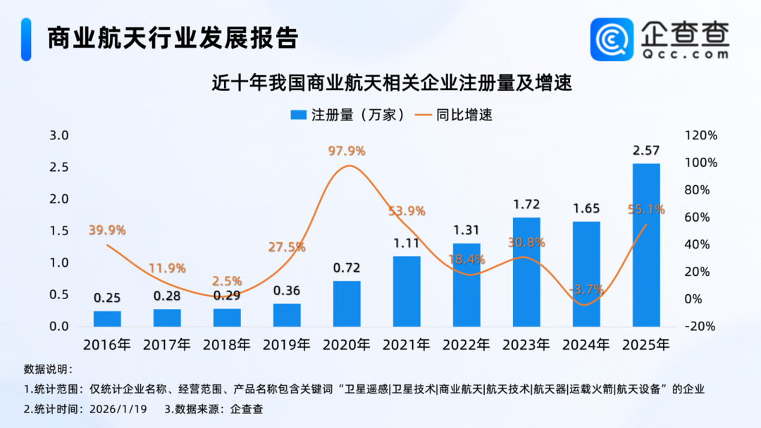 近十年,我国商业航天相关企业注册量基本逐年增加,其中2020年注册量同比大幅增加97.9%至0.72万家,达近十年注册量增速峰值,2025年全年,我国累计注册2.57万家商业航天相关企业,同比增加55.1%,创近十年相关企业注册量新高。