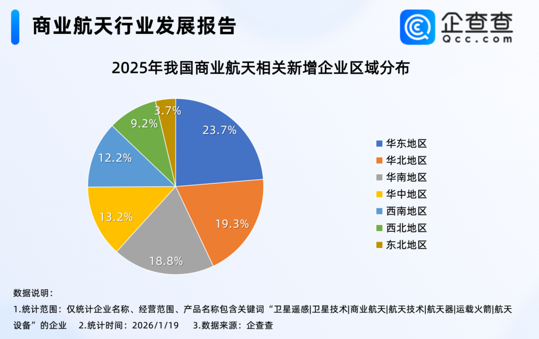 2025年注册的2.57万家商业航天相关企业中,位于华东地区的相关企业最多,占比23.7%,其次是华北地区,占比19.3%,东北地区相对最少,占比3.7%。