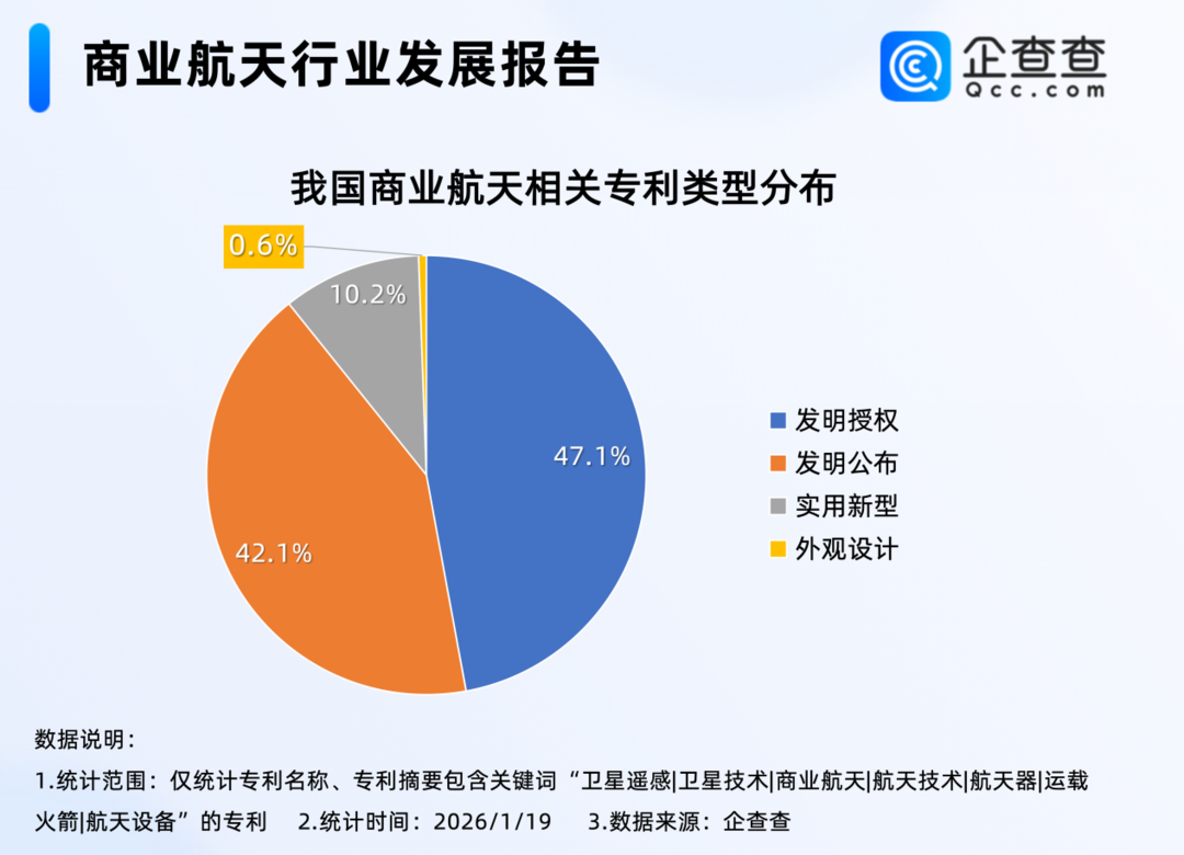 企查查数据显示,2025年全年,我国商业航天相关企业注册量同比增加55.1%至2.57万家,创近十年注册量新高,其中华东地区最多,占比23.7%,其次是华北地区,占比19.3%;专利方面,我国现有2.1万项商业航天相关专利,从类型上来看,发明专利最多,占比近9成。