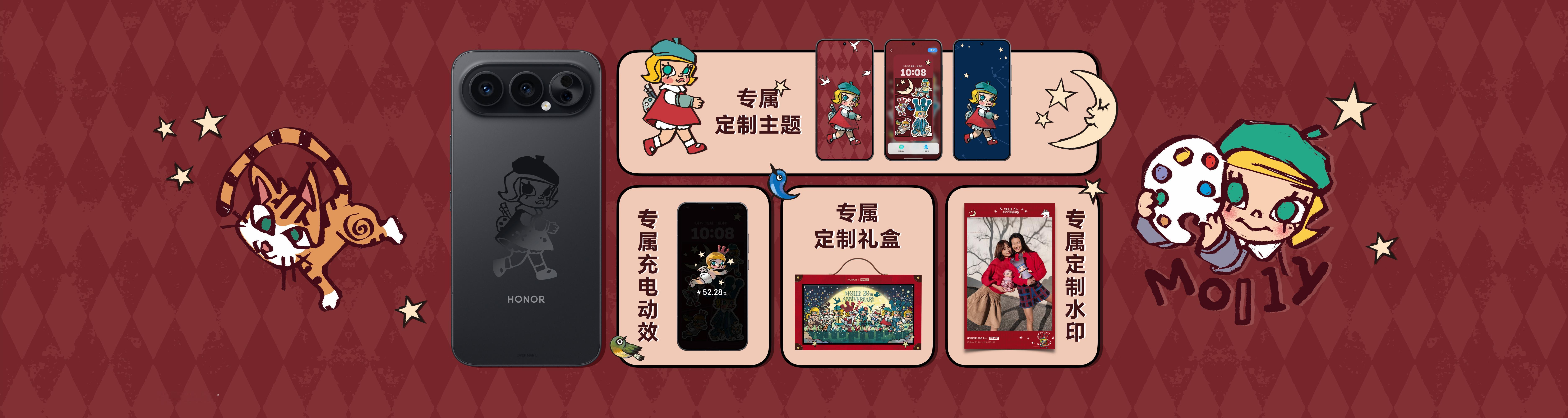 荣耀500ProMOLLY限定礼盒来了,超多限定版周边,火漆邀请函、MOLLY彩窗透卡、相机样式手机壳、定制卡针、手机挂以及胶片贴纸。另外,礼盒内更特别附赠年味十足的MOLLY定制红包与对联冰箱贴。荣耀500ProMOLLY限定礼盒