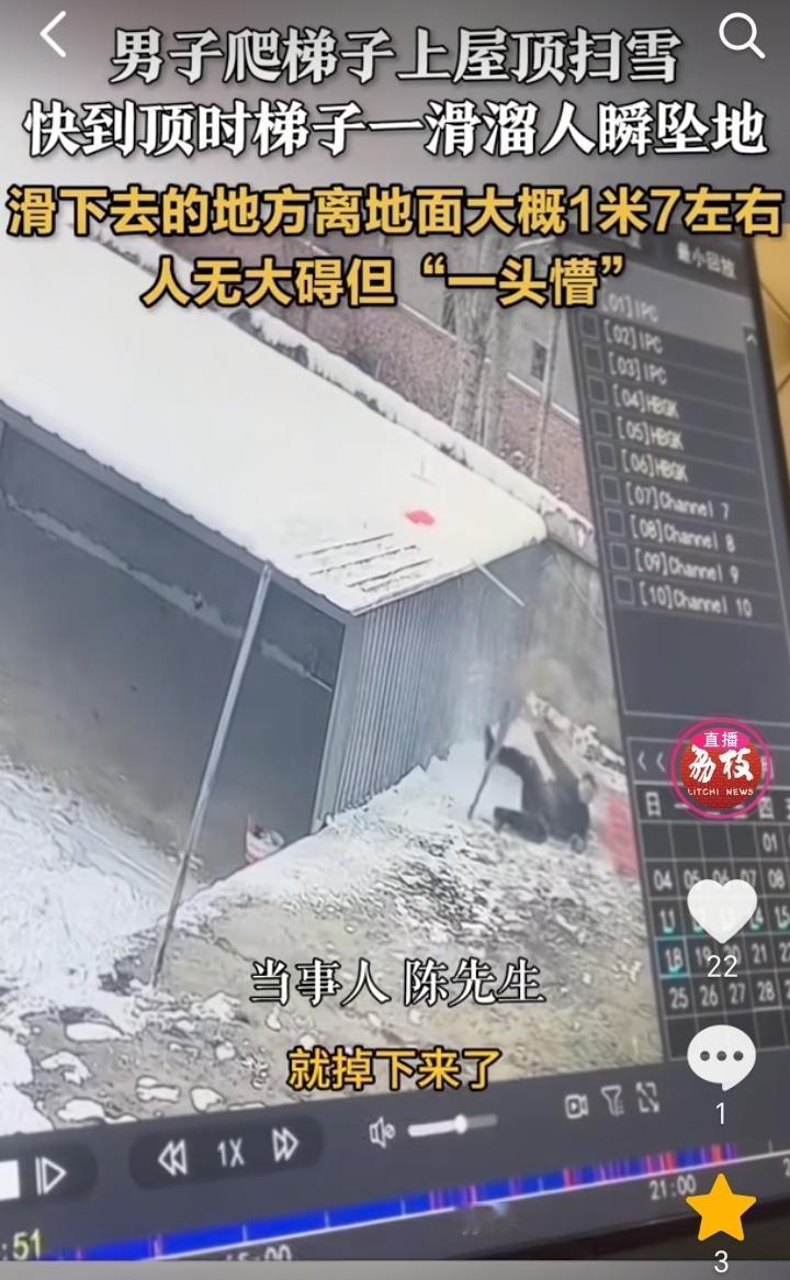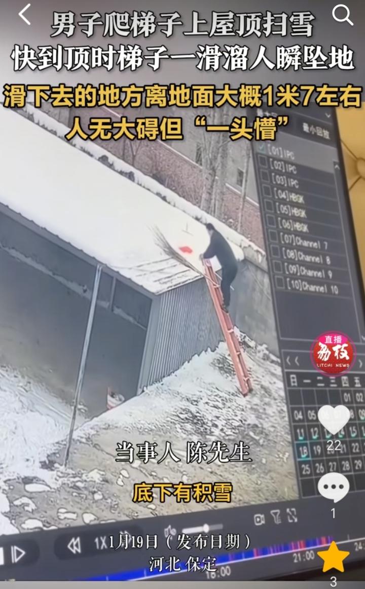“还是年轻”!河北保定,大雪过后屋顶上有积雪,于是男子就想着把屋顶积雪给清理下,他爬着梯子上屋顶,结果因为太滑没有扶稳直接掉了下来,滑下去的地方距离地面有1米7左右,摔了一个跟头,好在人没事,不过当时都懵了。 1米7左右掉下去人没事,还是年轻,如果上年纪的人从这个高度掉下去,那可能就会伤筋动骨了。 下雪原本地上也滑,屋顶上的雪可以不用打扫,等到自己化了也就好了,万一想打扫那也最好还是的有一个人给扶住梯子,这样也可以避免太滑掉下来。 生活中很多细节问题有时候都存在这安全隐患,所以千万不能大意,时刻要把安全放在第一位。