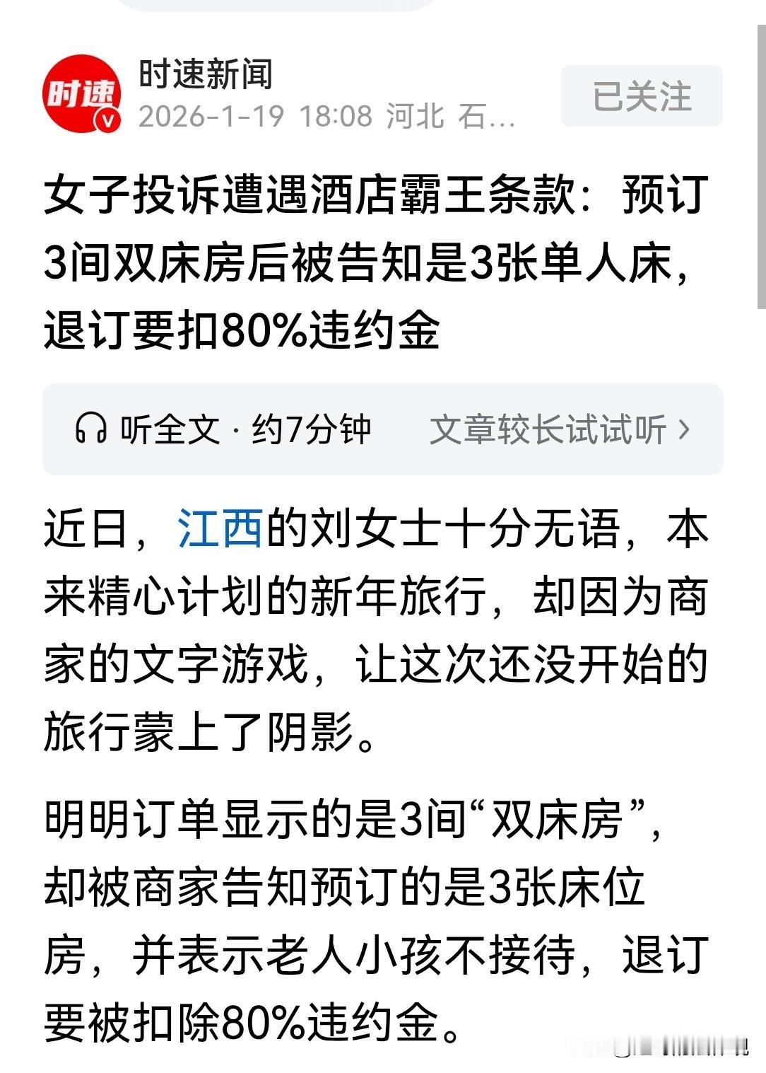 玩的全是套路!江西,女子打算过年期间去北海游玩,在某旅游平台预订了两间大床房,230元一间,入住时间是大年初二。本打算4名年轻人同行,后来又决定带上一个老人和一个婴儿,只好又加了一间双床房。不料,刚下单成功就被告知,民宿不接待老人和小孩,同时得知,他们订的是三间单床房,按床位收费。可订单明明写着双床房,因为和订单不符,打算退房时,却被扣80%的手续费,女子才发现,商家玩的更多的是文字游戏。 刘女士和朋友打算在过年期间,来一场说走就走的旅行。 为此他们精心做了计划,想过一个和往年不同的春节。 可万万没想到,提前预定的房间出问题了。 导致这场旅行还没开始,就已泡汤,让人十分沮丧。 4个年轻人,在春节假期准备去北海旅游。 北海是热门旅游地,想要吃好、住好,肯定要提前做好攻略。 经过讨论,他们准备订两间民宿,又方便,还花钱少。 1月13日,刘女士提前一个多月,在某旅游服务平台,预定了两间北海某庭院民宿。 民宿价格也不贵,4人订了两个房间,支付了460元。 地点就在银滩附近,入住时间是大年初二。 订单显示,房间为双床房,下单成功后,后来她又想带上家里的一名53岁的长辈,和一个4个月大的婴儿。 刘女士只好再次下单了一间同房型的双床房。 这次却和上次不同,她刚支付成功,平台就弹出了提示。 刘女士简单的看了一下,突然发现了问题。 文字显示,该民宿仅限18岁至50岁的客人入住,老人小孩概不接待。 怎么还会有这么奇怪的规定呢,53岁就被算作老年人了吗,刘女士直接懵了。 她认为,如果入住是有条件的,商家应该提前告知。 再说,预定前两间房的时候,并没有提示。 她正想咨询商家时,就接到了民宿工作人员打来的电话。 对方称,让她确认一下,她定的是三张床位,刘女士顿时感到不妙。 因为她下单的是双床房,工作人员却让确认是三个单人床。 而且工作人员称,一个房间只能住一个人,按床位收费。 为了证实自己没有看错,刘女士找到订单,上面确确实实的写着,预定的就是三间双床房。 一天还没有住过,咋就变成了三张床位? 刘女士经过仔细查看后认为,这是商家在玩玩文字游戏。 如果在下单前告知,他们肯定不会订这样的房间。 最主要的是,商家没提前告知不接待老人和小孩。 但是有一点,刘女士不明白,春节期间,按说这样的民宿应该是一房难求。 那么,商家的这番操作到底是几个意思呢? 接下来,当她因为无法入住退房时,才看明白商家的套路。 原来他们盯的就是退房这一块。 果然,当刘女士认为,三间单床房无法入住,提出退房时,被告知要扣80%的手续费。 明明还没入住,却被扣了大部分的钱,搁谁心里也会不舒服,这也太不公平了! 而且下单前啥也不说,下单成功后,问题都出来了。 商家不仅玩的是文字游戏,而且属于欺骗消费者。 刘女士表示,当时她多次找商家协商退费的事,都被拒绝了。 而且对方的态度非常恶劣,他向平台投诉了,暂时未未收到处理结果。 如今他们陷入了进退两难的境地。 如果不退,6个人肯定住不开,还要另加钱再订房间,老人、孩子仍无法入住。 没办法的情况下,还要去另找其他酒店,来解决老人孩子的住宿问题。 如果退房的话,三间房的房费将被扣去80%。 这两种方式,刘女士都无法接受,但商家却认为,他们有权利选择接待人群。 商家表示,刘女士预定的房间,是他们这里销量最大的一款产品。 是刘女士没看到,在宣传页的下方标注了,房间是1.2米的单人床,只能一人入住。 最下面提示,不可携带儿童入住,但未显显示限制老人入住。 记者亲测,商家只提醒50岁以上,以及孩子太小,他们不接待,但并未提示按床位收费的事。 记者还没问几句,工作人员就烦了,称他们可以自行选择接待人群。 刘女士向平台投诉了,暂时未得到答复。 她把自己的遭遇发到了网上,没成想,有很多人有同样的遭遇。 那么,这事从法律的角度来分析,如何看待呢? 《消费者权益保护法》第8条 :消费者享有知悉其购买、使用的商品或者接受的服务的真实情况的权利。 民宿在订单中标注双床房,却实际按床位收费,且未提前明确告知,不接待老人小孩,属于隐瞒关键信息。 消费者下单前,有权知道房间类型、入住限制,等核心信息。 商家故意不说清楚,就是侵犯了消费者知情权,让消费者被套路。 《民法典》第577条:当事人一方不履行合同义务或者履行合同义务不符合约定的,应当承担继续履行、采取补救措施或者赔偿损失等违约责任。 刘女士按双床房下单,商家却提供单床位,未告知不接待老人小孩,属于履行合同不符合约定。 退房时扣80%手续费,明显不合理,商家没按订单提供服务,属于违约。 商家隐瞒信息、违约在先, 刘女士可要求平台介入,或向市监局投诉,要求退还全款。 对此你怎么看?