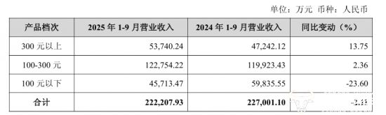 此外,金徽酒自身产品结构也比较稳健。2025年前三季度,公司营收主力100-300元产品营业收入为12.28亿元,同比增长2.36%,300元以上产品收入5.37亿元,同比增长13.75%,而100元以下产品同比下降23.60%至4.57亿元,为金徽酒唯一下降的产品档次,拖累了公司整体业绩。