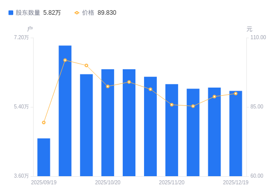 日期A股户数(户)流通A股户均持股数(股)户均持股市值(万元)2026-01-09450934904.4455.672025-12-19581533803.0034.162025-12-10590263746.7533.242025-11-28587323765.5132.122025-11-20599103691.4731.672025-11-10618333576.6632.692025-10-31637803467.4832.592025-10-20638023466.2832.032025-10-10624983538.6135.382025-09-30699533161.4932.22