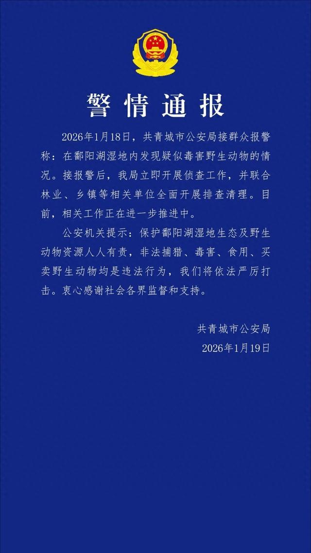 江西省共青城市公安局2026年1月19日通报:2026年1月18日,共青城市公安局接群众报警称:在鄱阳湖湿地内发现疑似毒害野生动物的情况。接报警后,我局立即开展侦查工作,并联合林业,乡镇等相关单位全面开展排查清理。目前,相关工作正在进一步推进中。
