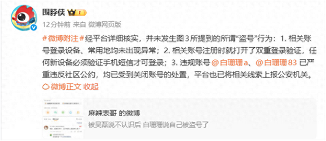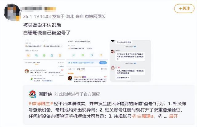 1月19日,有网友举报“被吴磊说不认识后,白珊珊说自己被盗号了”相关内容,@围脖侠发文回应:经平台详细核实,并未发生图3所提到的所谓“盗号”行为:1.相关账号登录设备、常用地均未出现异常;2.相关账号注册时就打开了双重登录验证,任何新设备必须验证手机短信才可登录;3.违规账号@白珊珊a、@白珊珊83已严重违反社区公约,均已受到关闭账号的处置,平台也已将相关线索上报公安机关。
