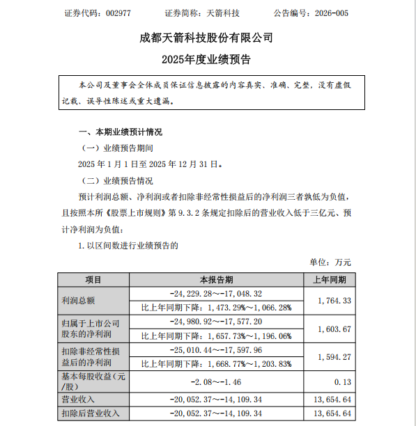 1月19日晚间,天箭科技发布公告称,基于2025年业绩预告,公司将被实施退市风险警示,股票简称前将被冠以“*ST”字样。