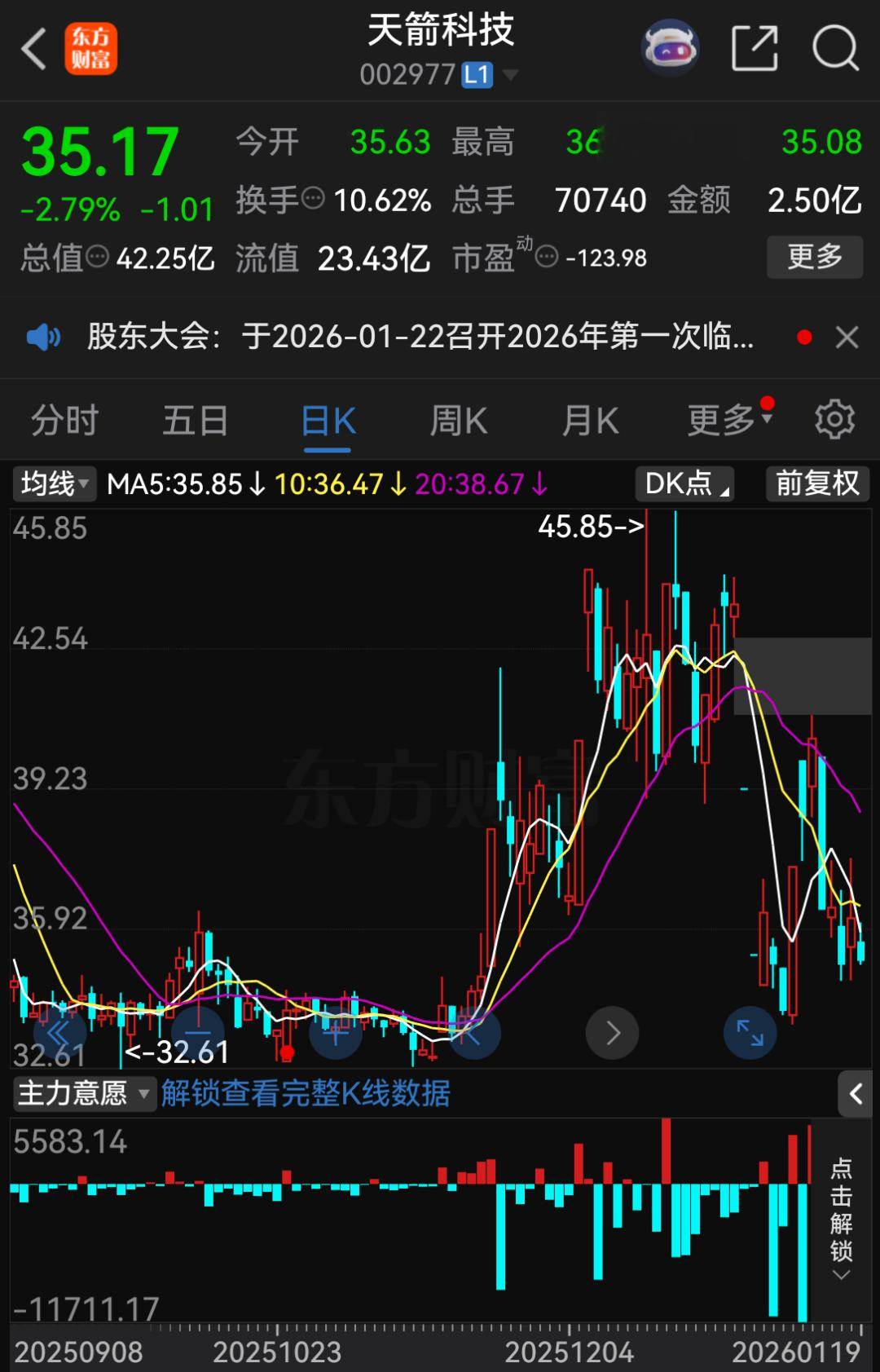 截至1月19日收盘,天箭科技股价报35.17元/股,跌幅达2.79%,总市值为42.25亿元。截至2025年9月30日,公司股东人数为2.211万户。