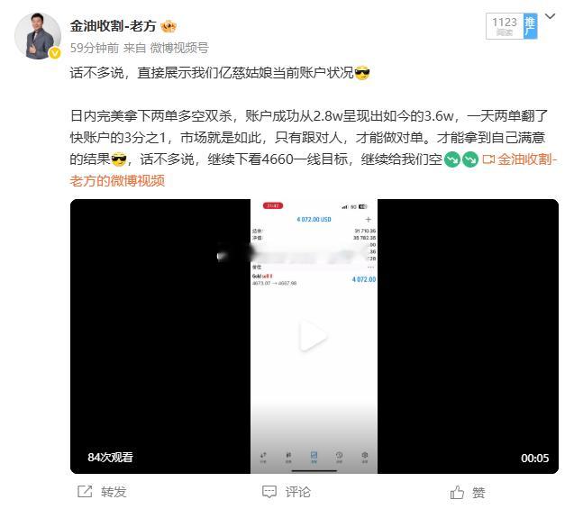 日内多空双杀!两单部署同步精准落地,你们跟上了也无需特意感谢我,只希望大家在开心的过程中能够想起老方就行,长篇大论的客套话就不多说啦,人一兴奋真的会词穷, 那就好好沉浸在这份实实在在的收获里,慢慢感受赚米的幸福感,最后别忘了,给老方点个赞,让我也沾沾你们的喜气,接下来我们继续并肩同行,拿捏更多收米的机会!接下来的操作就仅供实盘了,大家有什么问题欢迎私信咨询老方,不论是解套还是聊心,都可以黄金 金价