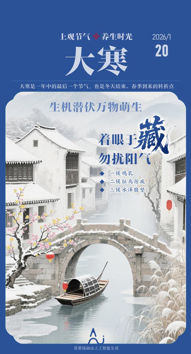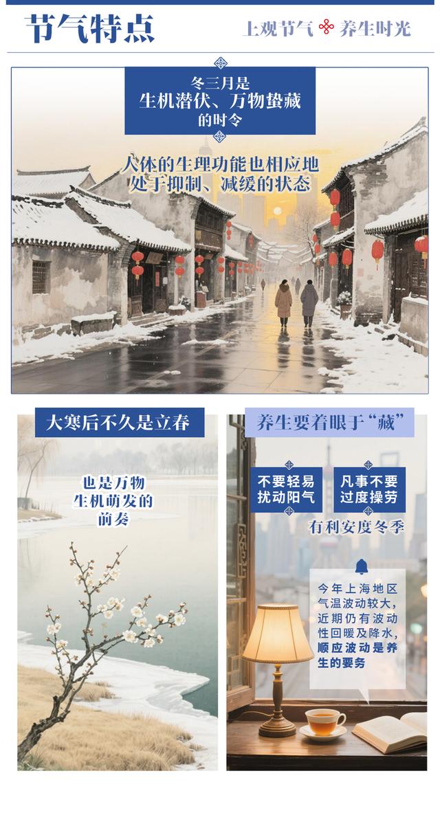 大寒是一年中的最后一个节气,也是冬天结束、春季到来的转折点。冬三月是生机潜伏、万物蛰藏的时令,人体的生理功能也相应地处于抑制、减缓的状态。大寒后不久是立春,也是万物生机萌发的前奏。养生要着眼于“藏”,不要轻易扰动阳气,凡事不要过度操劳,有利安度冬季。