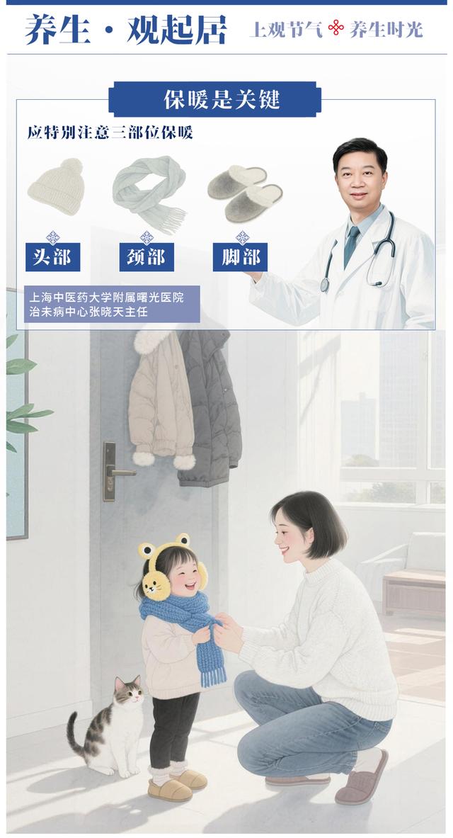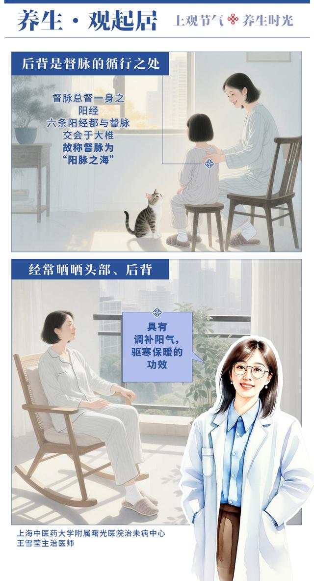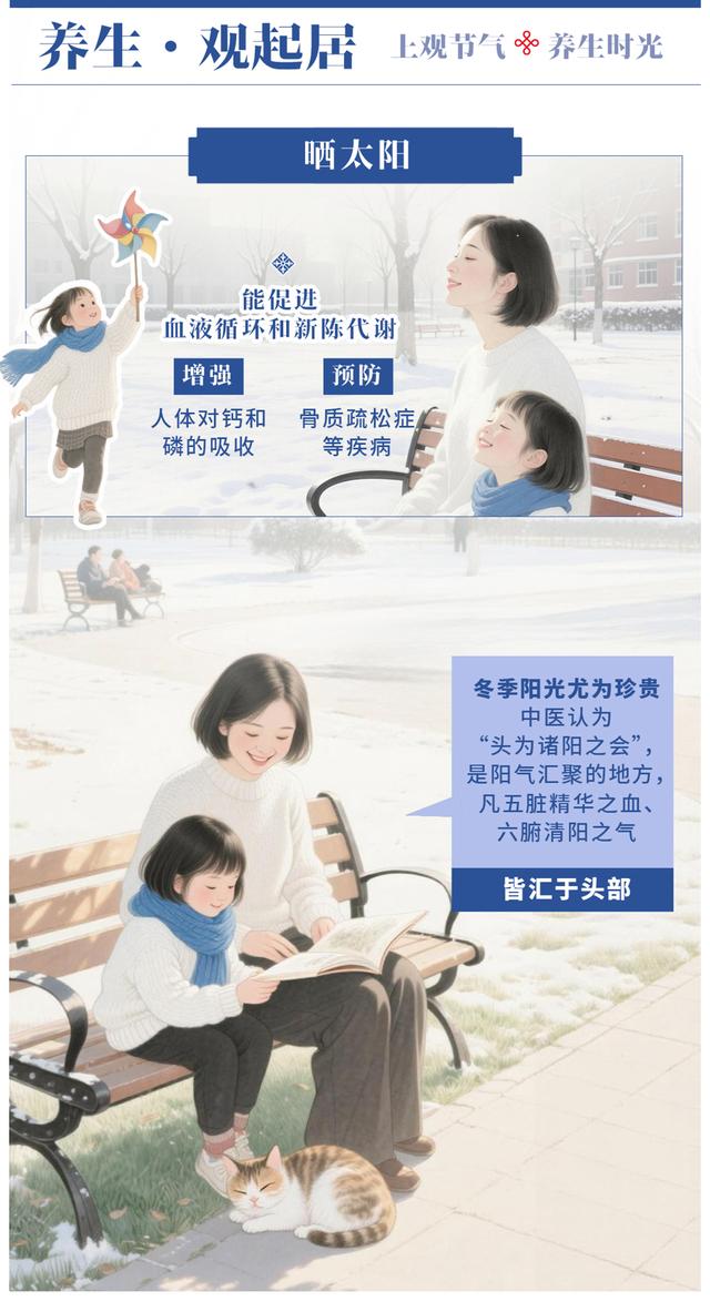 保暖是关键,应特别注意头部、颈部和脚部的保暖。晒太阳能促进血液循环和新陈代谢,增强人体对钙和磷的吸收,预防骨质疏松症等疾病。冬季阳光尤为珍贵,中医认为,“头为诸阳之会”,是阳气汇聚的地方,凡五脏精华之血、六腑清阳之气,皆汇于头部。后背是督脉的循行之处。督脉总督一身之阳经,六条阳经都与督脉交会于大椎,故称督脉为“阳脉之海”。经常晒晒头部、后背具有调补阳气,驱寒保暖的功效。