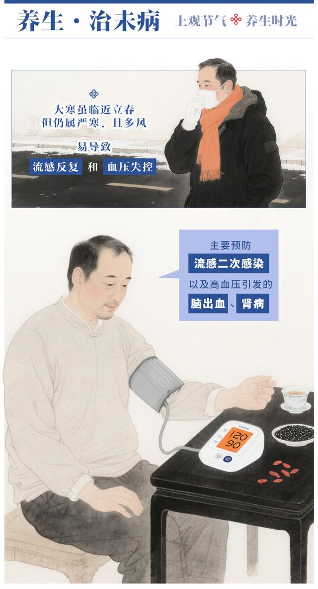 大寒虽临近立春,但仍属严寒,且多风,易导致流感反复和血压失控。主要预防流感二次感染,以及高血压引发的脑出血、肾病。