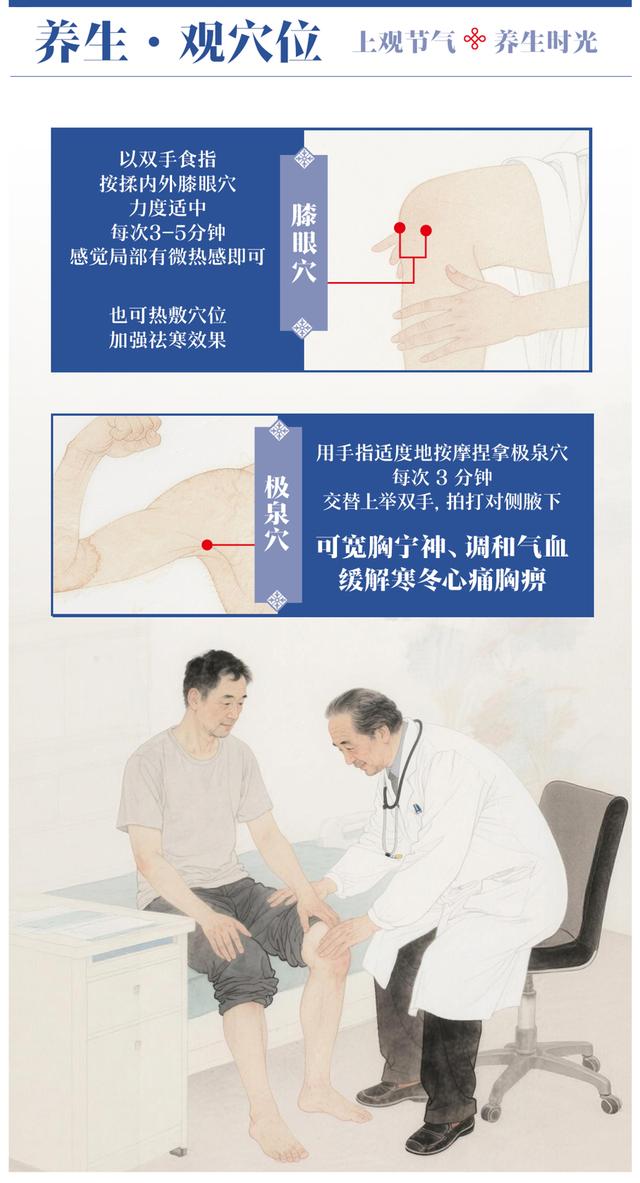 以双手食指按揉内外膝眼穴,力度适中,每次3-5分钟,感觉局部有微热感即可;也可热敷穴位,加强祛寒效果。