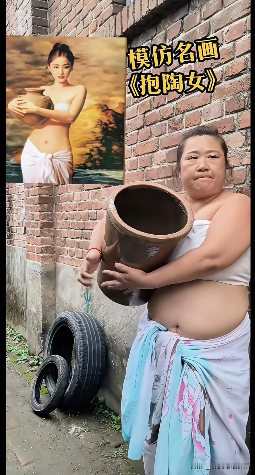 咋样? 像吗?模仿名画:抱陶女。这就是生活,快乐更来源于生活,也只有自己快乐了,才有如此的大胆设想,不求美如画,只求自己那颗少女心,挺好!万事都有个梦想,咱就是向往抱陶女,那才叫:美! 大家别笑俺,你若来试一试,还不一定赶上俺来,不就是腰粗了点儿,脸大了点儿,表情僵硬了点儿,陶瓷罐子黑了点儿,其他的还是挺不错滴,自我感觉挺满意,咱也得做成油画,挂到墙上,起名:抱陶女人。 大家觉得行吗?听你们的。