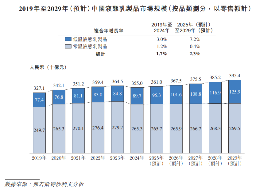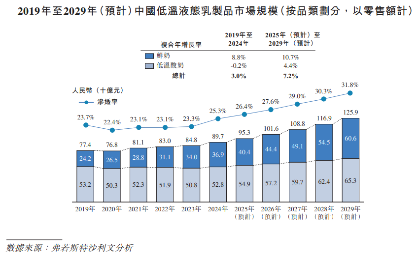 2024年,公司位列中国低温液奶市场第二位,市场份额达14.5%。低温液奶是中国液奶市场中增长最快的细分领域,2024年市场规模达人民币897亿元,预计于2029年增至人民币1,259亿元。2025年至2029年,该市场预计按7.2%的复合年增长率增长。