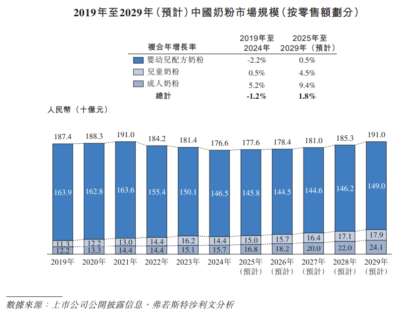 婴幼儿配方奶粉是中国奶粉市场中最大的细分市场。随着新国目标实施推动行业集中度提高,以及消费者对A2蛋白、OPO结构脂和乳铁蛋白等科学验证配方的支付意愿增强,支持行业持续结构性升级。按零售额计算,中国婴幼儿配方奶粉市场在2024年达到人民币1,465亿元,占奶粉总市场的83.0%。