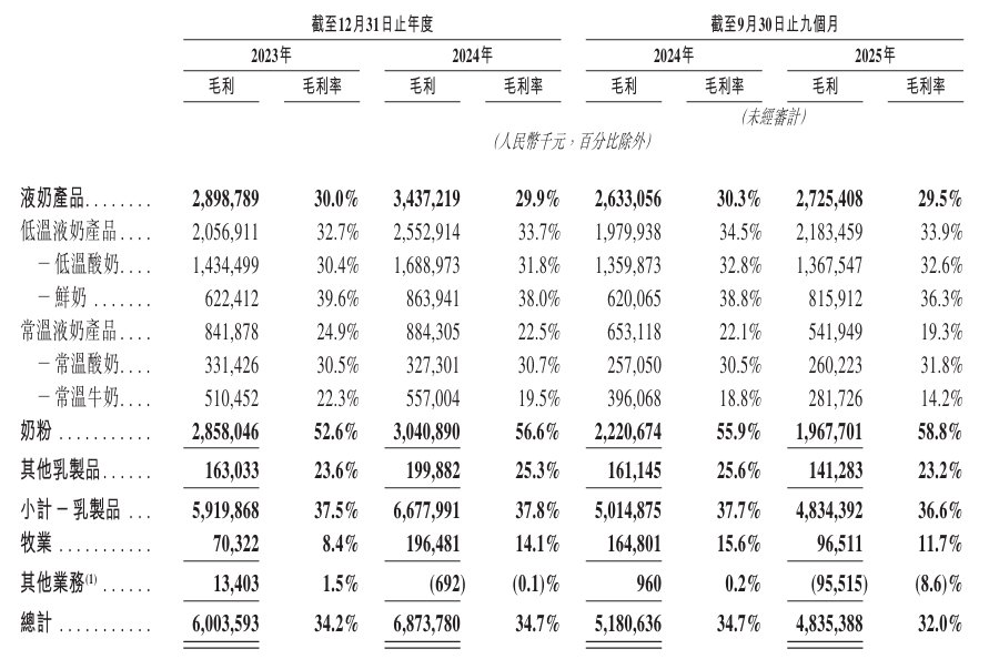 于2023年度、2024年度、2024年截至9月30日止九个月、2025年截至9月30日止九个月,公司录得毛利分别约为60.04亿元、68.74亿元、51.81亿元、48.35亿元,对应毛利率分别为34.2%、34.7%、34.7%、32.0%。