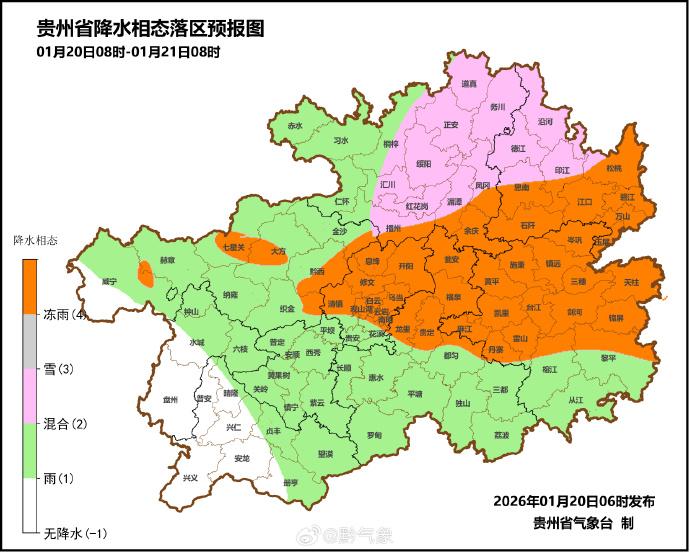 1月19日08时至20日08时,毕节市的威宁,贵阳市的开阳,遵义市的务川、湄潭,铜仁市的万山、松桃、江口、玉屏、碧江,黔东南州的三穗、丹寨、凯里、台江、岑巩、锦屏、镇远、雷山、麻江、黄平、黎平,黔南州的瓮安、福泉、贵定、都匀等24个县最低气温在0℃及以下,最低气温万山-4.8℃;省的中东部地区有47个县(市、区)降温幅度在8℃以上,最大降幅雷山县雷山16.4℃。贵阳市的开阳,铜仁市的万山、思南、松桃、江口、沿河,黔东南州的三穗、麻江、黄平,黔南州的惠水、都匀等11个县出现雨夹雪或冰粒;铜仁市万山出现0.2毫米的电线积冰;另外,6县域内的19个观测站出现中雨(最大为习水县桑木镇森林村习水森林15.1毫米);六盘水市的盘州,毕节市的大方、织金、金沙,贵阳市的开阳,铜仁市的万山等6县出现大雾,最低为大方71.0米。