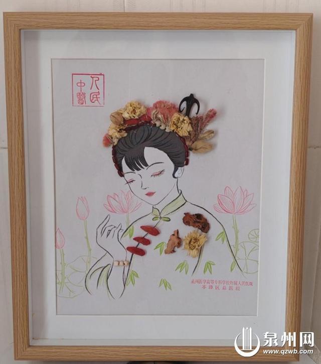 据介绍,这些画作创作取材于大众熟悉的十多种中药材,医护人员凭借专业积淀与奇思妙想,将一片片普通的药草叶、一朵朵药用干花化身成“簪花围”艺术品,让杏仁的温润、薏苡仁的洁白、玫瑰花的艳红、茉莉的素雅与茯苓的纯净相互映衬。画作既呈现了蟳埔女簪花头饰的清丽脱俗,又充分展现了中药材的天然质感,令人赏心悦目。