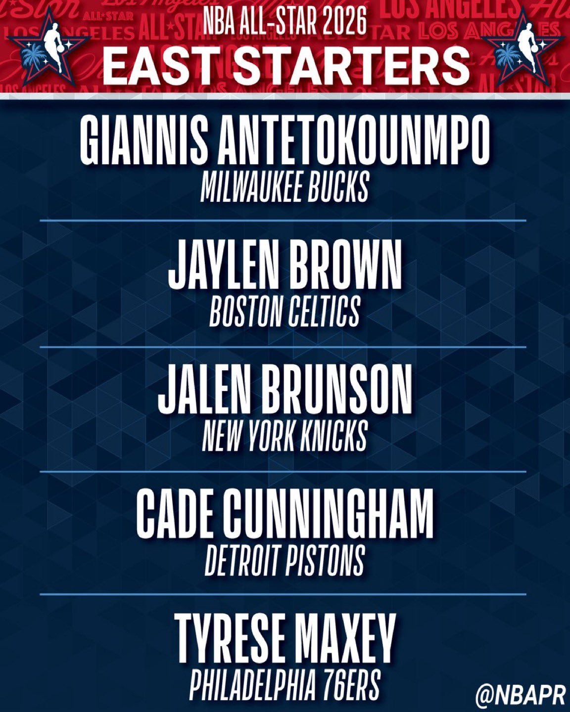 NBA官方于今日发布,本届全明星先发阵容西部:卢卡东契奇、尼古拉斯约基奇、斯蒂芬库里、谢伊吉尔杰斯亚历山大、维克托文班亚马东部:扬尼斯阿德托昆博、泰瑞西马克西、杰伦布朗森、凯德坎宁安、杰伦布朗恭喜来自洛杉矶湖人队的东契奇以340w2967票成为本届全明星的总票王2026年NBA全明星赛的首发阵容由三个投票小组决定:▪️球迷(50) %)▪️ NBA球员(25) %)▪️媒体小组(25) %)不过请注意,他们不会在同一支队伍中首发,因为本次全明星赛采用的是美国队对阵世界队的赛制。本次全明星举办时间(13-15日,北京时间往后推一天,14-16日)NBA |2026年NBA全明星首发公布