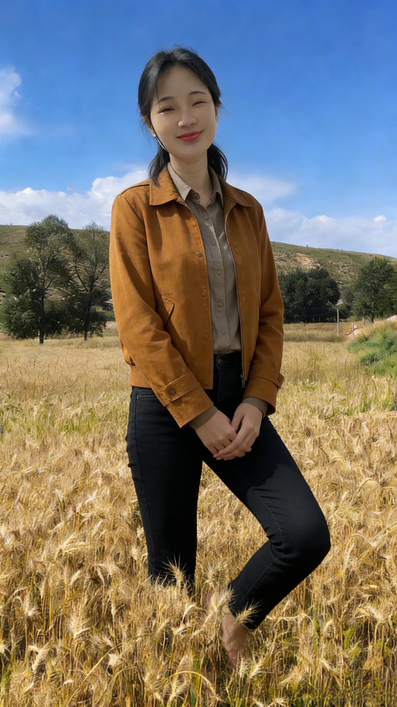 当褐色的夹克撞进金色的海 你便成了麦田里最生动的色块 指尖轻触麦芒的瞬间,阳光在指缝间流淌 目光垂落处,每一粒麦子都在生长 ~ 短发被风掀起,露出光洁的额头 你弯腰的姿势,像在和大地私语 说这一季的辛劳,说此刻的安宁 说风里满是成熟的香气 ~ 远处的云影在移动,你站在光影交界 一半是明亮,一半是温柔 麦浪起伏,如同岁月的呼吸 而你是其中,最鲜活的涟漪