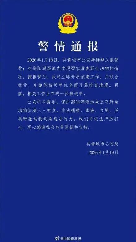 据共青城市公安局1月19日发布的警情通报,1月18日该局接到群众报警,称在鄱阳湖湿地发现疑似毒害野生动物的情况。接警后,公安机关立即启动侦查程序,并协同林业、乡镇等单位对相关区域进行全面排查和清理。目前,案件正在进一步侦办中。