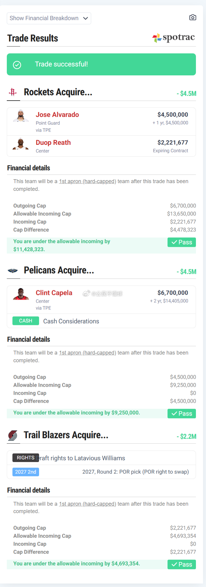 当时其实想想这么换就完事了,老六到期合同本来就预计要被送走,鹈鹕一堆后卫,一堆锋线,中锋不太靠谱,考虑到卡片的3年保障合同,把现金都给他们作为补偿就可以了。但是随着亚当斯的受伤,必须得有替补中锋。再单换已经不现实了...于是设计了方案二(图二),拉开拓者做第三方,送一个波特兰自己的27次轮换来里斯(本来也要卖..),丰富一下中锋类型(能投),这样火箭得到老六和里斯,鹈鹕得到卡片和现金,开拓者得到自己的次轮,各取所需。当然这样做的结果就是直接废掉JD了,因为人填满了没空位了,无法转正他,最后32场只能去G联厮混了...所以其实也不现实....主要还是亚当斯受伤导致必须要补个中锋的....休斯顿火箭
