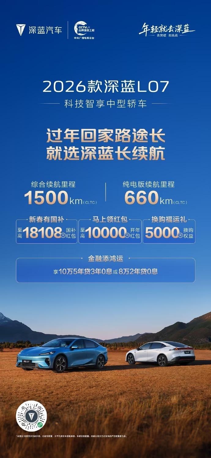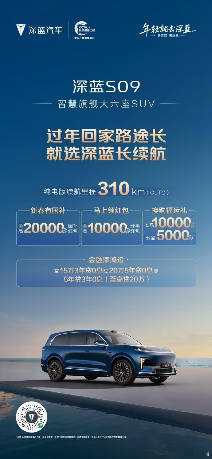 深蓝汽车推限时补贴政策新车情报局日前,我们从获悉,针对旗下多款车型推出至高购置税补贴10000元限时政策,并提供至高10000元换购礼、至高20000元国补礼以及至高5年0息金融礼。 其中深蓝G318无忧穿越版可享5000元购置税补贴、8000元换购福运礼、至高20000元国补红包以及15万5年贷3年0息或20万5年贷3年0息(秘境版)。深蓝L06部分车型可享5000元购置税补贴、至高5000元换购礼、至高18228元国补礼、享10万5年贷3年0息或8万2年贷0息。2026款深蓝L07可享5000元购置税补贴、8000元置换礼、至高18348元国补以及享10万5年贷3年0息或8万2年贷0息。深蓝S05 可享5000元购置税补贴、4000元置换礼、3000元换购礼、至高16908元国补红包以及享10万5年贷3年0息或8万2年贷0息;深蓝S07可享至高7000元购置税补贴、5000元置换礼、3000元换购礼、至高19548元国补红包以及享10万5年贷3年0息或8万2年贷0息;深蓝S09可享10000元购置税补贴、至高10000元换购礼、至高20000元国补红包以及至高20万5年贷0息。