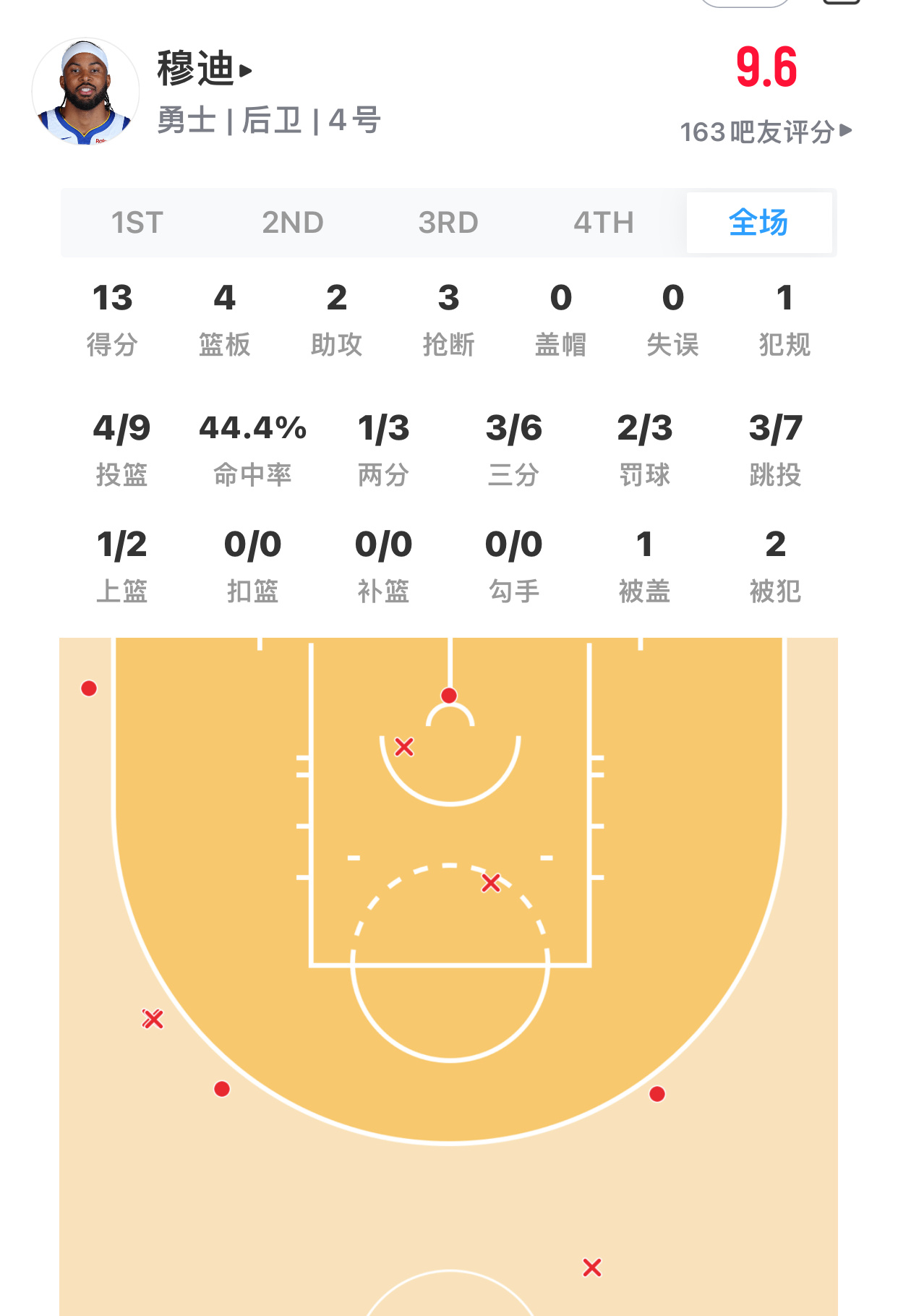 今日穆迪数据13分4篮板2助攻3抢断,三分6中3那个倒地长传真的很不错,希望后面