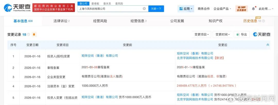 上海今风科技有限公司新增北京字跳网络技术有限公司为股东,注册资本增幅约24747%