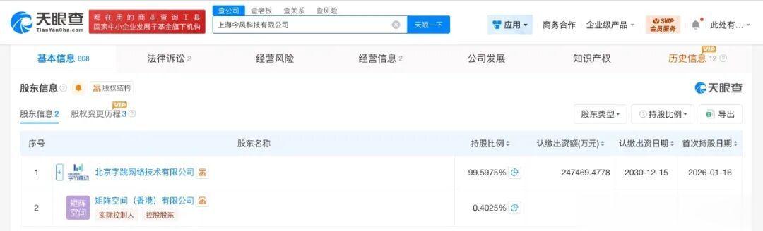 上海今风科技有限公司成立于2021年2月,法定代表人为司马拓,经营范围含网络科技领域内的技术开发、技术转让、技术服务、技术推广、技术咨询,软件开发,数据处理和存储支持服务,房地产开发经营等。股东信息显示,该公司现由北京字跳网络技术有限公司、矩阵空间(香港)有限公司共同持股。