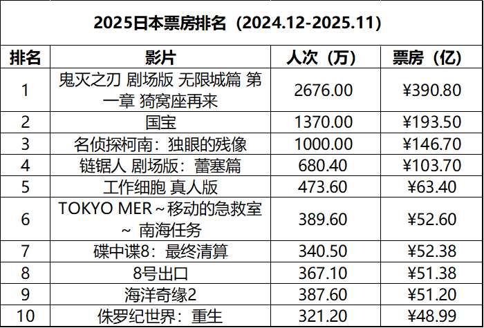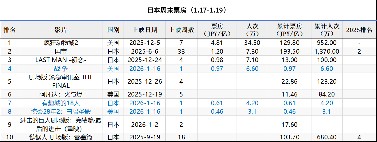 日本周末票房(1.17-1.19):1.《疯狂动物城2》7连冠,累计票房129.8亿日元排名日本影史第31;2.《国宝》IMAX版本公映票房大涨,1月23日起继续上映杜比视界版;3. A24《战·争》在新片中成绩最佳;4.《链锯人 剧场版:蕾塞篇》累计票房103.7亿排名日本影史第47。(数据来源:kogyotsushin、dorama)