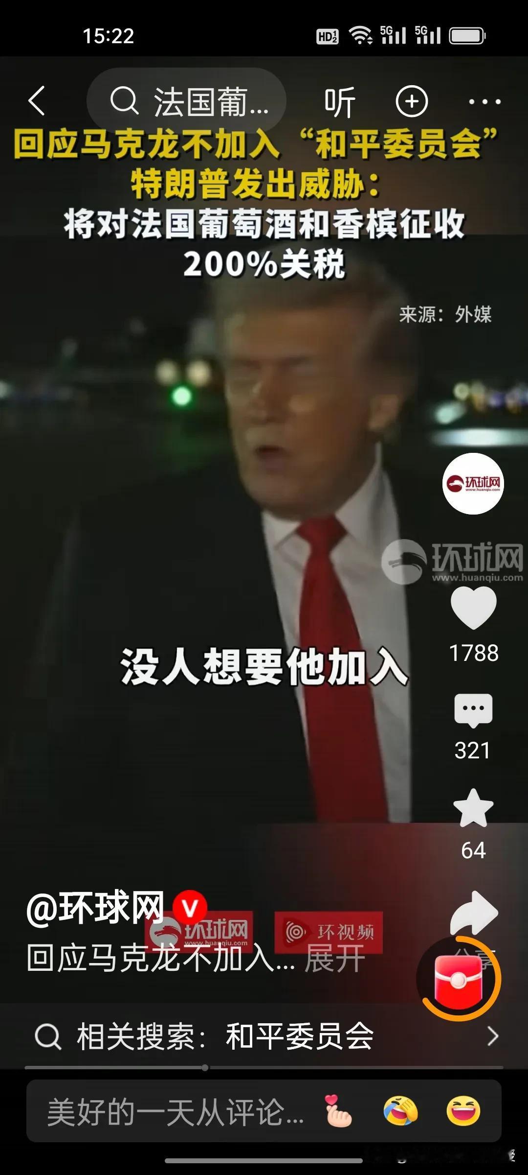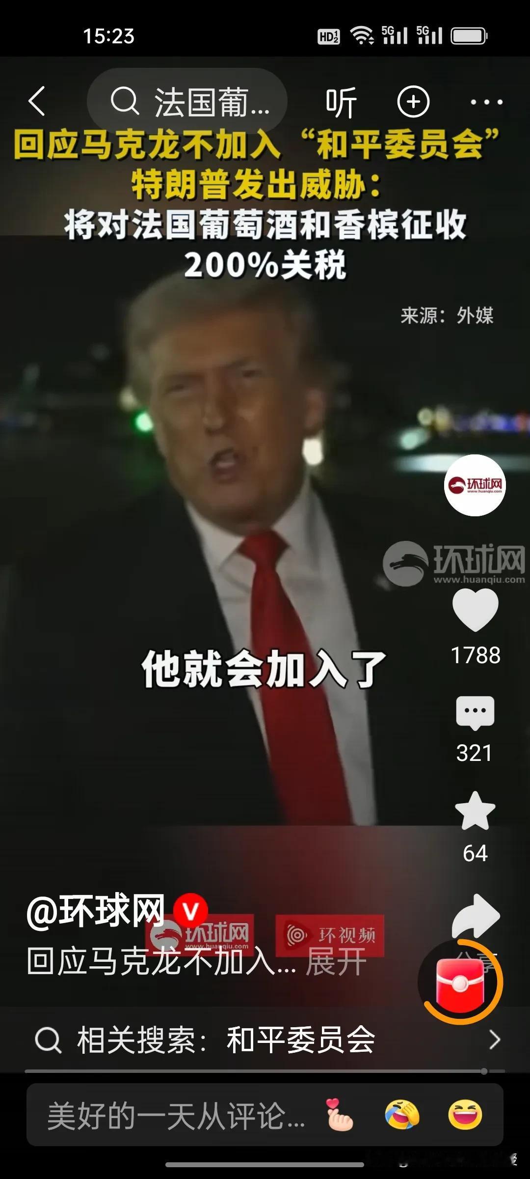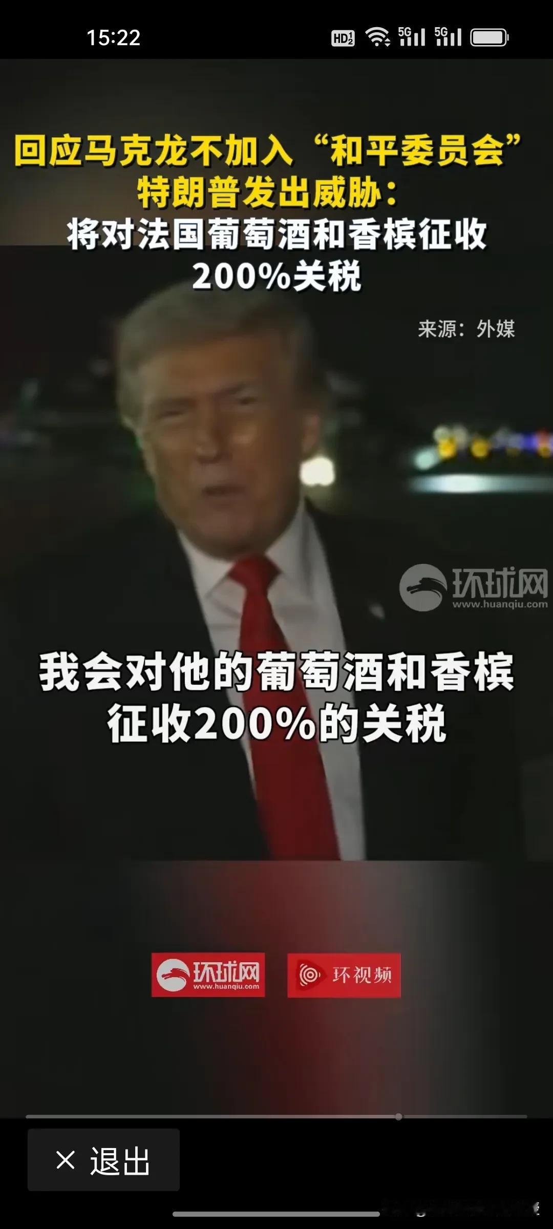 特朗普一点都不给马克龙面子!称不加入和平委员会就加关税! 当记者问特朗普,马克龙不加入和平委员会时,特朗普说他不在乎,因为他快要卸任了。他将会对葡萄酒和香槟加征200%的关税,这样他就会加入了。 现在各国该知道了吧,这60个国家如果不加入和平委员会的话,特朗普就会用加关税的方式来制裁。可以说是拿捏住了各国的软肋逼着这些国家必须要加入。60个国家可就是600亿美元啊!在真金白银面前,特朗普可不会松口。法国因为派兵到格陵兰岛已经被特朗普加了关税,如果这次因为拒绝入会再被加税,法国的企业将会受到重创,等待马克龙的又将是轰轰烈烈的大罢工。