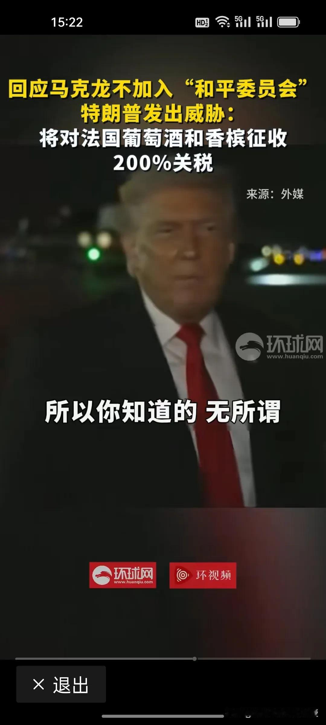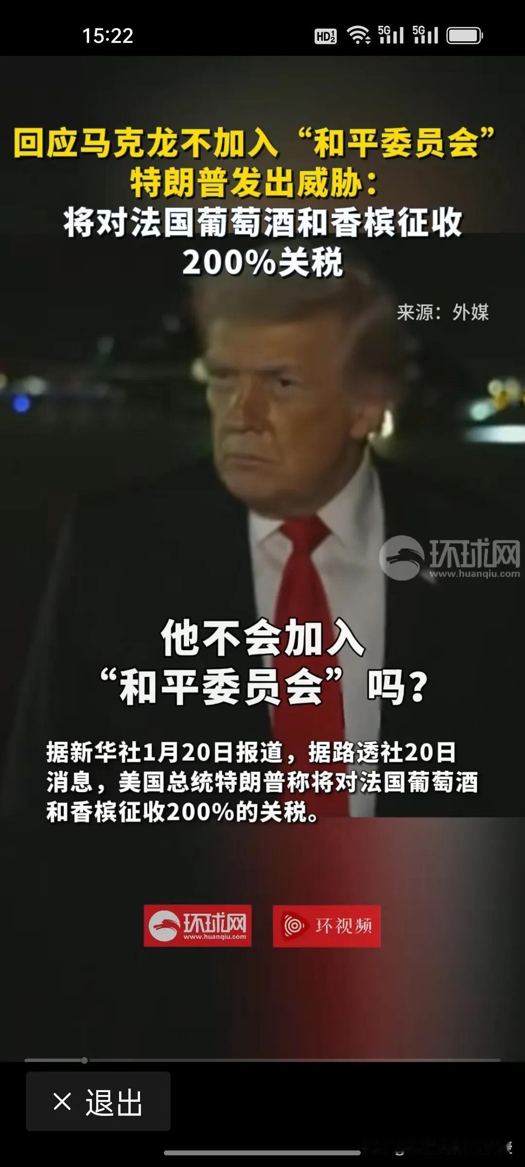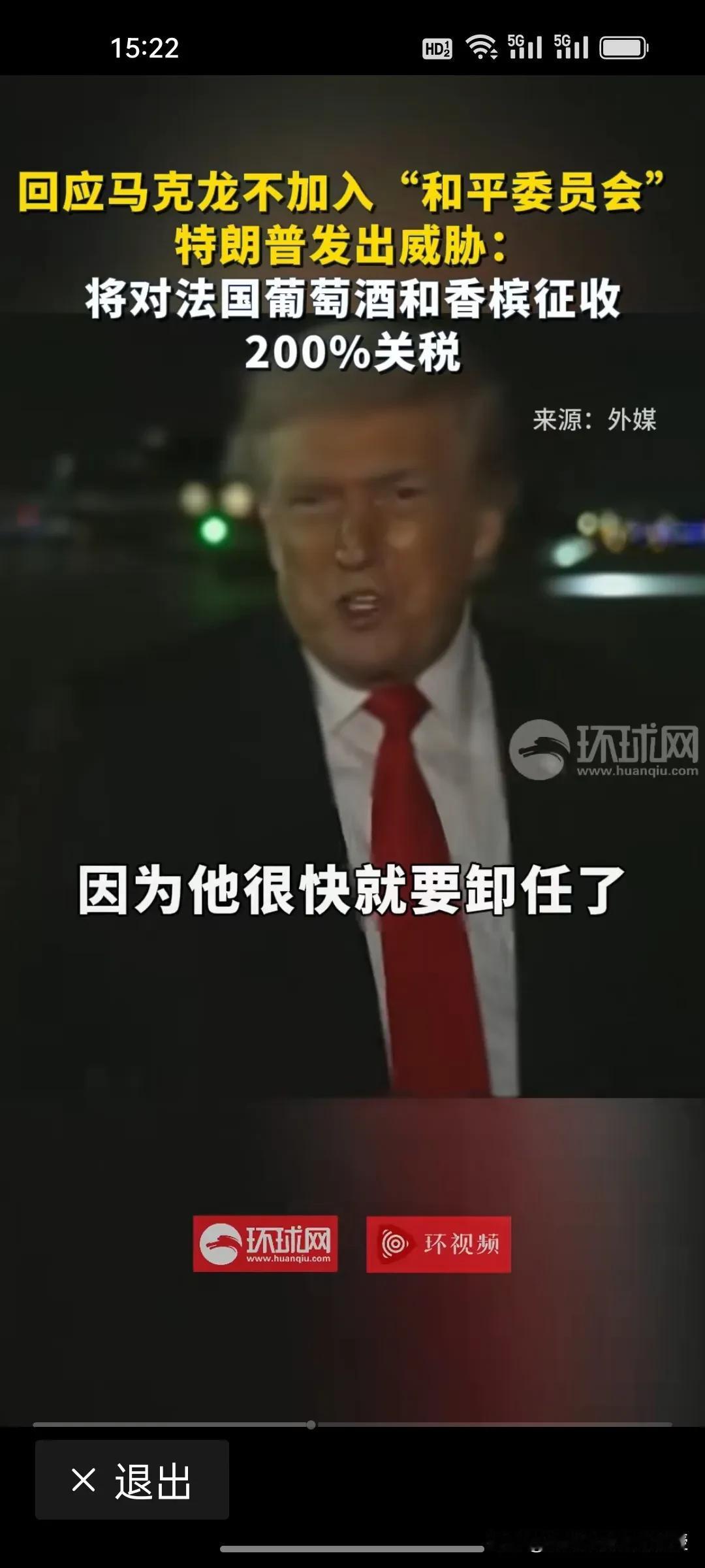特朗普一点都不给马克龙面子!称不加入和平委员会就加关税! 当记者问特朗普,马克龙不加入和平委员会时,特朗普说他不在乎,因为他快要卸任了。他将会对葡萄酒和香槟加征200%的关税,这样他就会加入了。 现在各国该知道了吧,这60个国家如果不加入和平委员会的话,特朗普就会用加关税的方式来制裁。可以说是拿捏住了各国的软肋逼着这些国家必须要加入。60个国家可就是600亿美元啊!在真金白银面前,特朗普可不会松口。法国因为派兵到格陵兰岛已经被特朗普加了关税,如果这次因为拒绝入会再被加税,法国的企业将会受到重创,等待马克龙的又将是轰轰烈烈的大罢工。