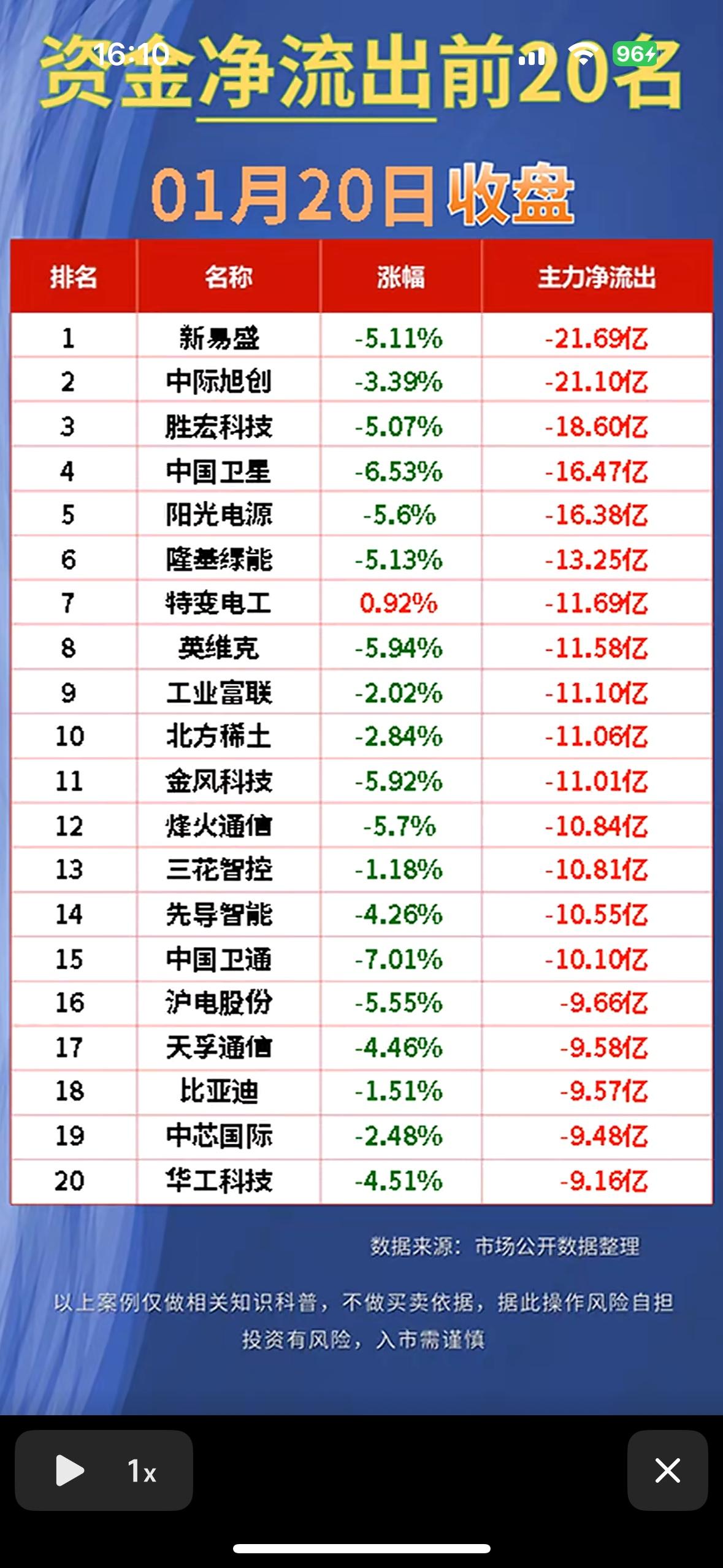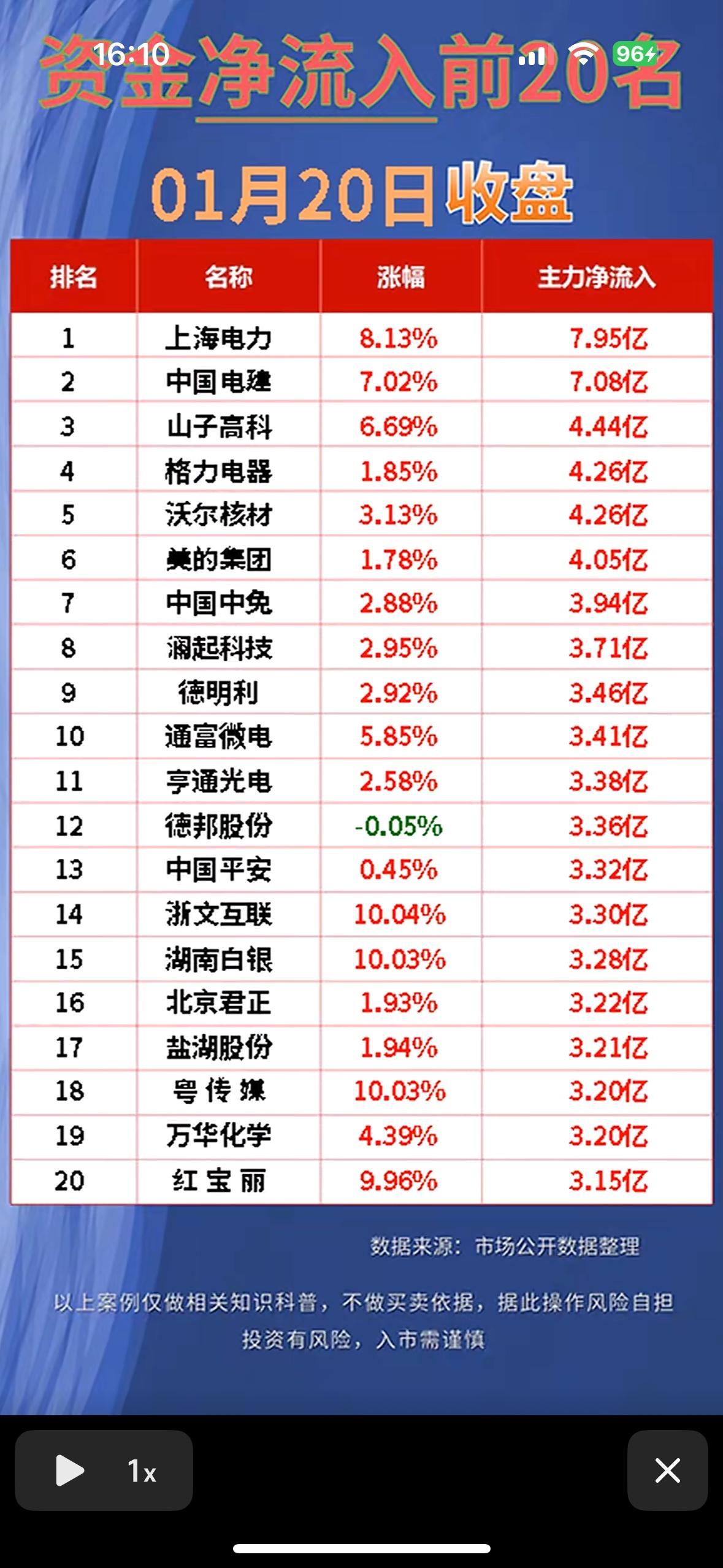 “2026年1月20日资金净流入前20名股票排行榜”📈💰 "电力基建领涨,家电科技跟风,资金抢筹龙头股,市场热度攀升需谨慎。" 资金流入榜:中国电建、格力电器领涨,美的集团、中免跟投,科技股澜起表现亮眼