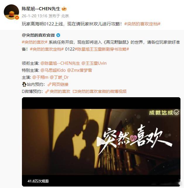 陈星旭马思超新剧接档 陈星旭与马思超新剧《突然的喜欢》定档1月22日,接档两人共同参演的热播剧《轧戏》。又可以一直看到两位帅哥合作演戏了,观众简直太幸福了追剧看起来~2025微博之夜爆款创作大赛